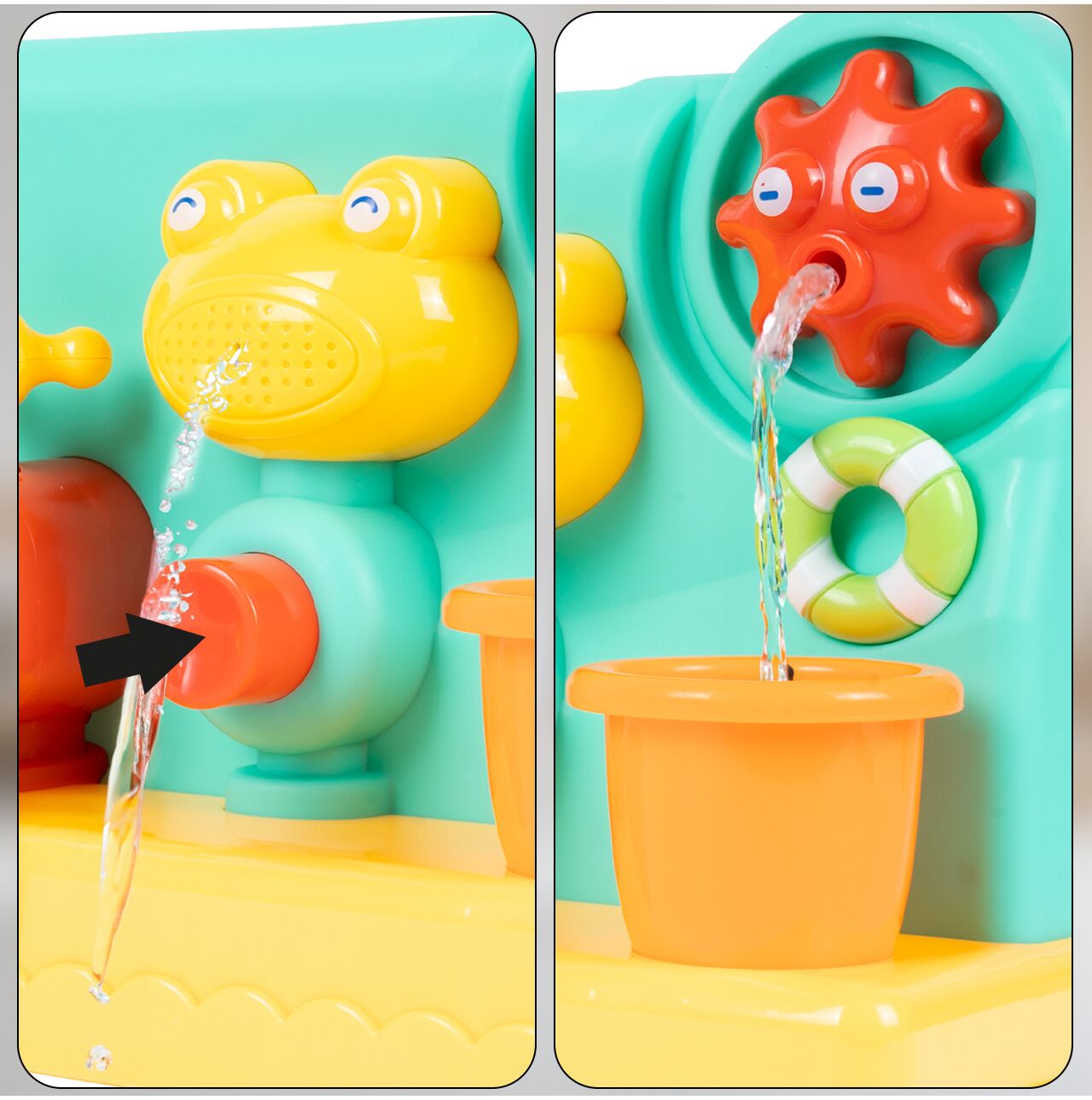 Mithilfe von Bechern können Sie Wasser in das Spielzeug gießen oder einfach zusehen, wie es durch die Löcher im Boden entweicht.