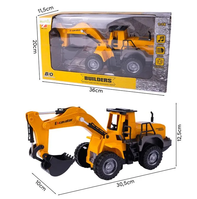 Das Spielzeug ist mit Licht- und Soundeffekten ausgestattet, die beim Spielen für mehr Realismus sorgen. Die Lichter in den Rädern und die Geräusche eines arbeitenden Baggers führen das Kind in die Atmosphäre einer echten Baustelle ein. Diese Effekte werden aktiviert, wenn sich das Fahrzeug bewegt, was das Spiel noch spannender macht.