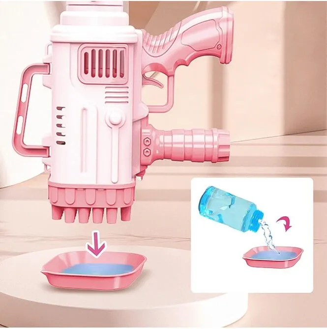Nalijte kapalinu do nádoby, která je součástí sady, a poté do ní ponořte otvory na přední straně pistole. Stiskněte spoušť bazuky a je to! Od této chvíle se můžete kochat pohledem na krásné duhové bubliny vznášející se ve vzduchu, které se vynořují z až 32 jamek najednou!