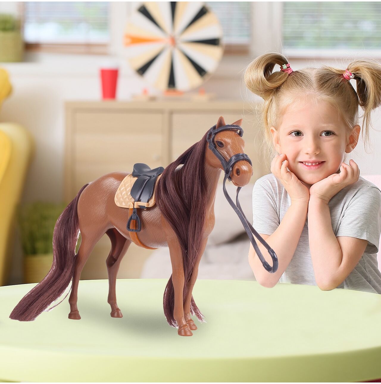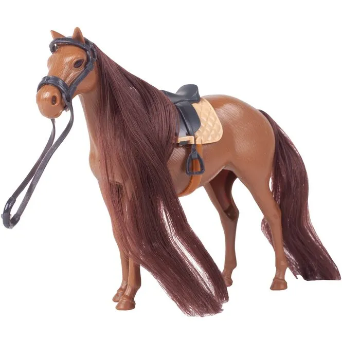Mít vlastního koně je snem většiny dětí, proto představujeme rozkošného upravujícího koně s uzdečkou a sedlem. Kůň je vyroben z materiálu příjemného na dotek. Má dlouhou, bujnou hřívu a ocas, který sahá až k zemi.