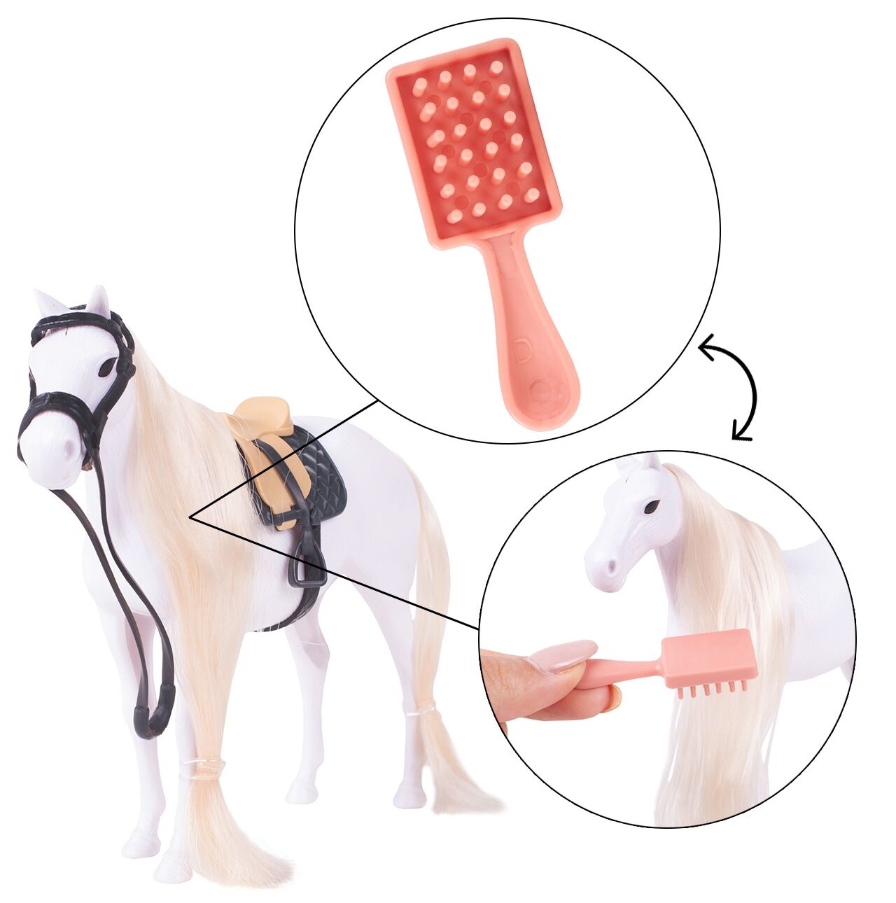 Sada obsahuje i kartáč na rozčesávání. Dlouhé vlasy koně lze různě upravovat a vytvořit tak zajímavý účes. Ideální pro samostatné hraní nebo s menšími panenkami.