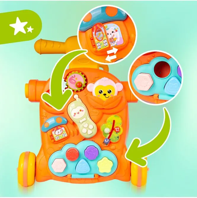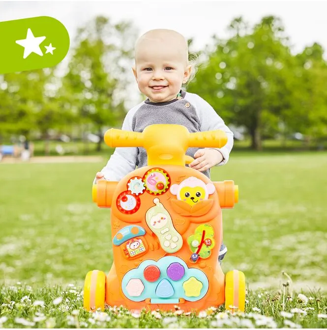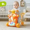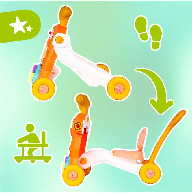 - Funkcje: chodzik/pchacz, jeździk/odpychacz, pchajka z rączką; panel interaktywny z dźwiękami