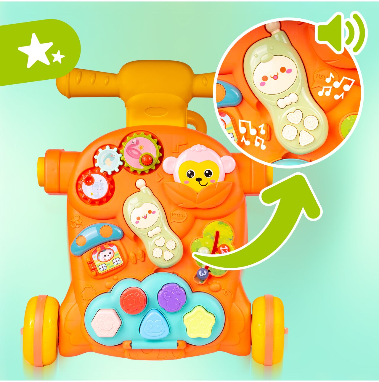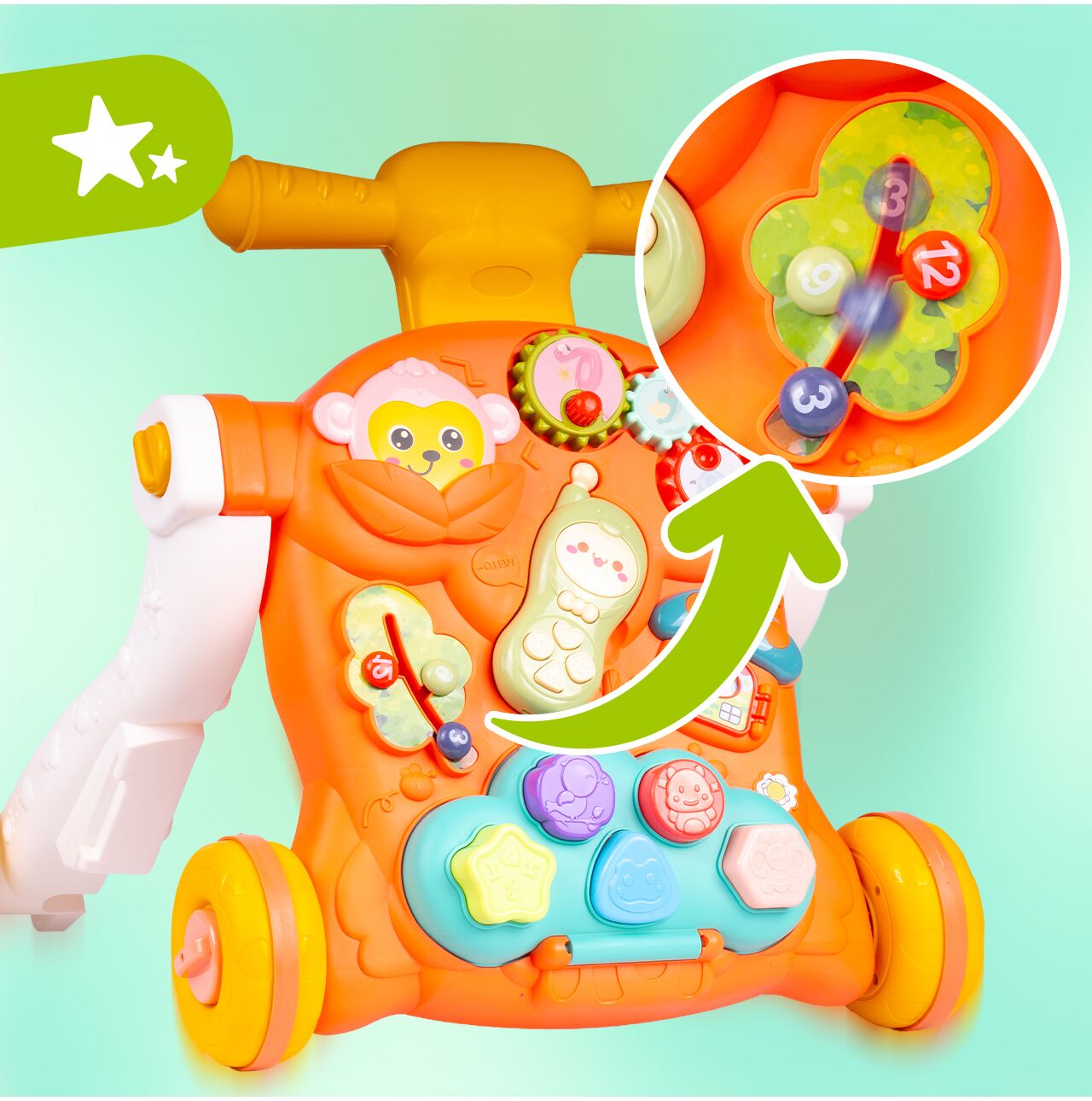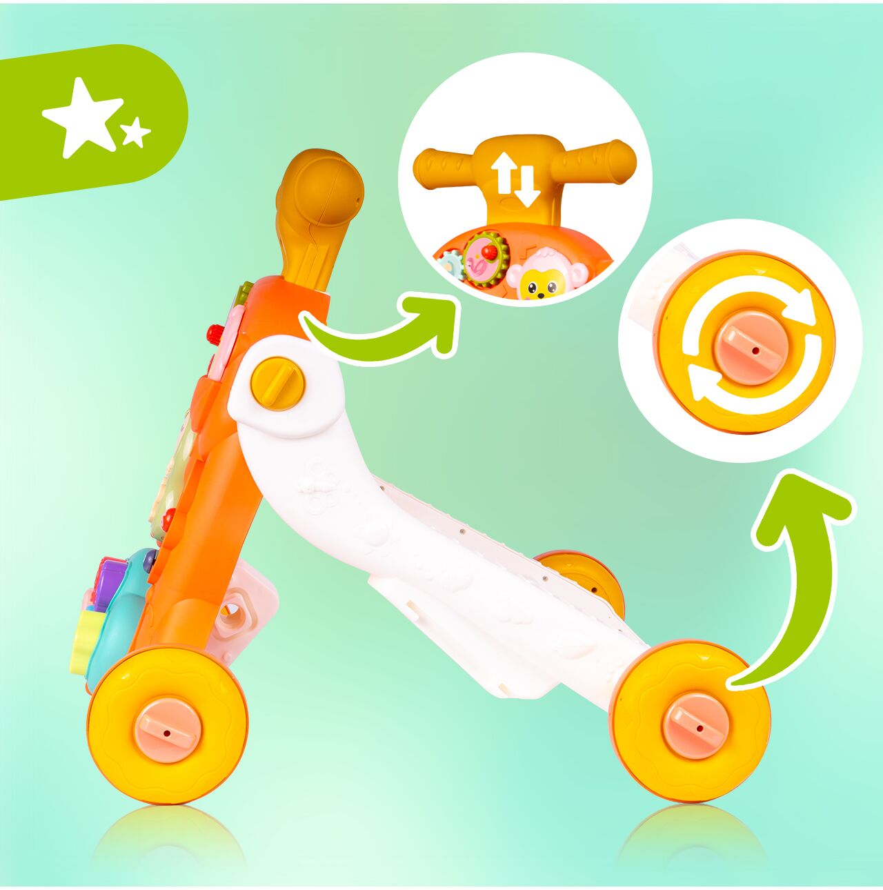 - Funkcje: chodzik/pchacz, jeździk/odpychacz, pchajka z rączką; panel interaktywny z dźwiękami