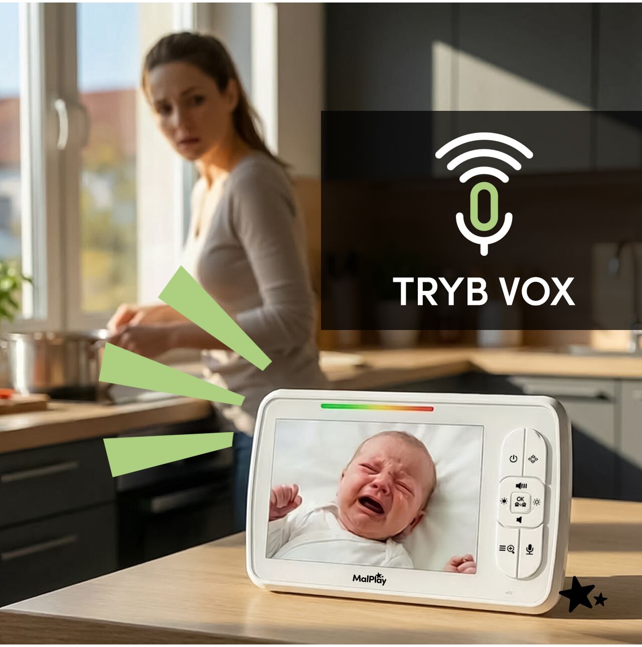 Režim VOX (s nastavitelnou citlivostí) navíc umožňuje chůvě reagovat na zvuky z dětského pokoje a v případě potřeby aktivovat náhled.