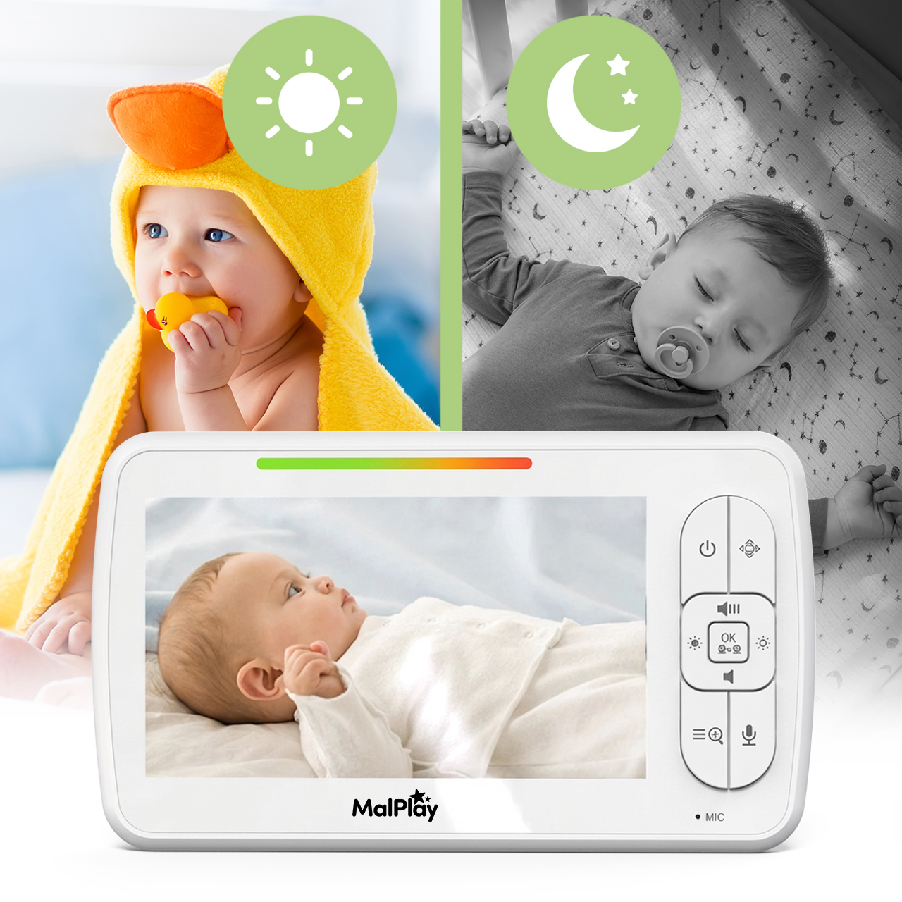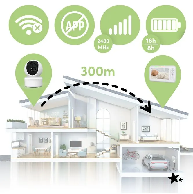 - Videochůva s kamerou a velkým 5,0" HD monitorem – jasný obraz vašeho dítěte v reálném čase bez nutnosti Wi-Fi