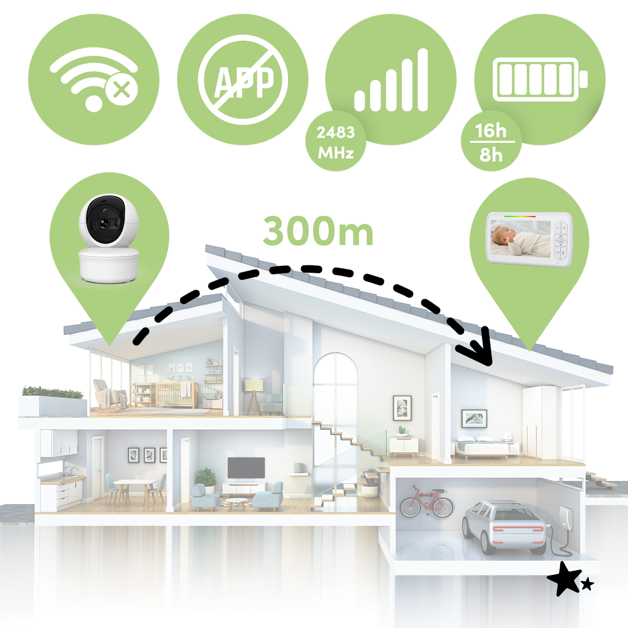 - Dosah přenosu až 300 m v otevřeném prostoru – volnost pohybu po domě