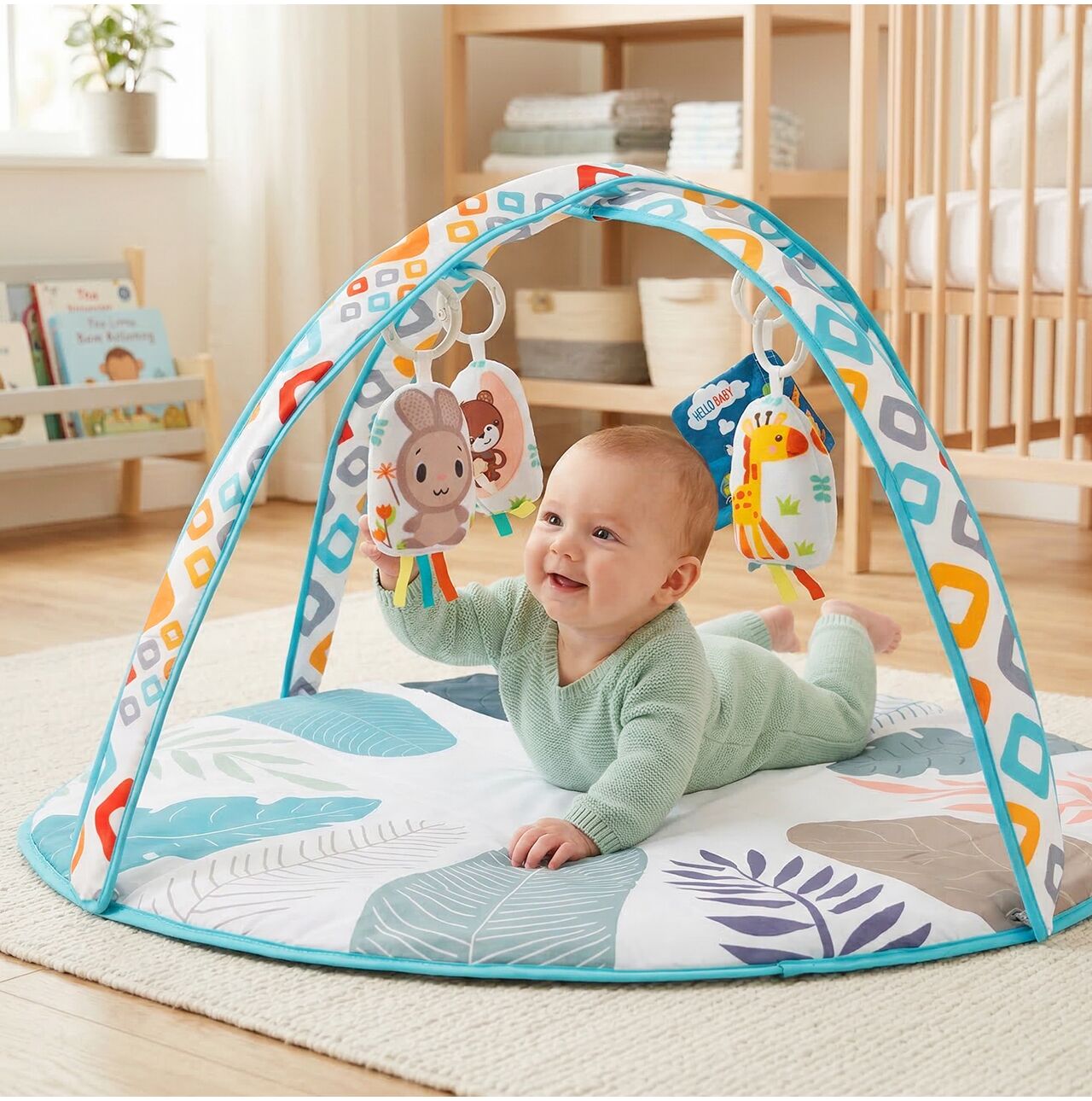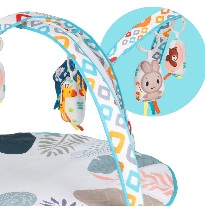 Nad podložkou jsou umístěny barevné, měkké přívěsky se zvířecími motivy a látková brožura. Ty pomáhají dětem procvičovat zaostřování, dosahování, uchopení a objevování nových tvarů. Rozmanité prvky dělají z podložky nejen místo k ležení, ale i aktivní herní plochu.