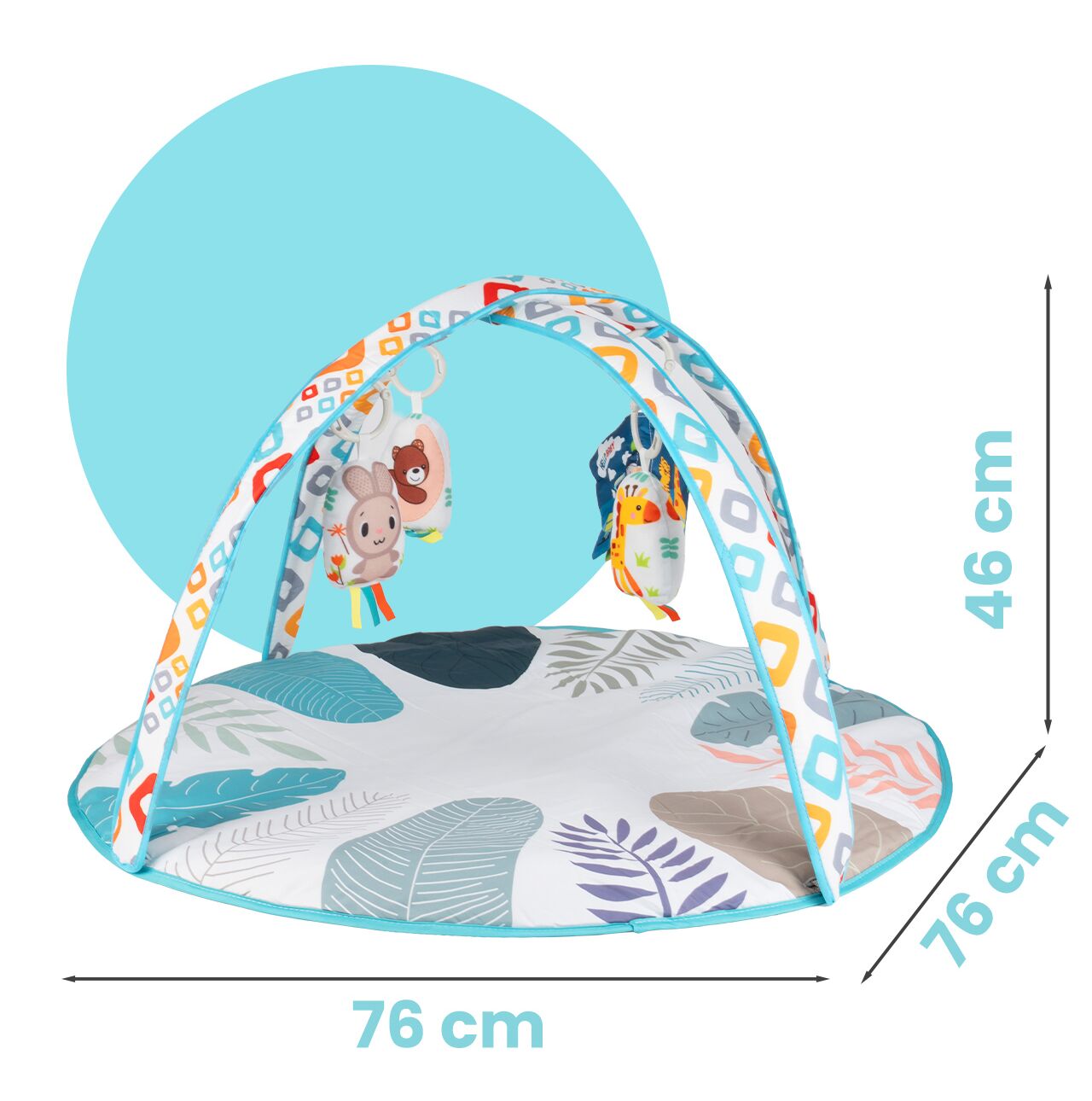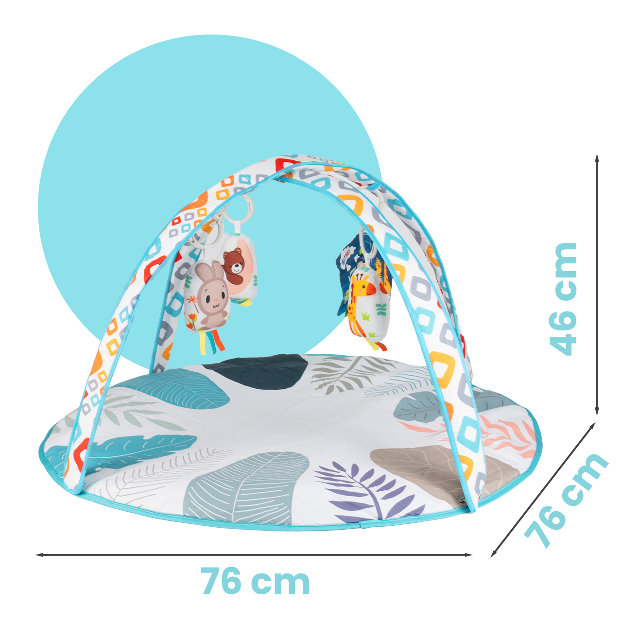 - Výška cca 46 cm – oblouky jsou zavěšeny ve vhodné výšce, aby je batole mohlo volně vidět a dosáhnout na ně.