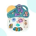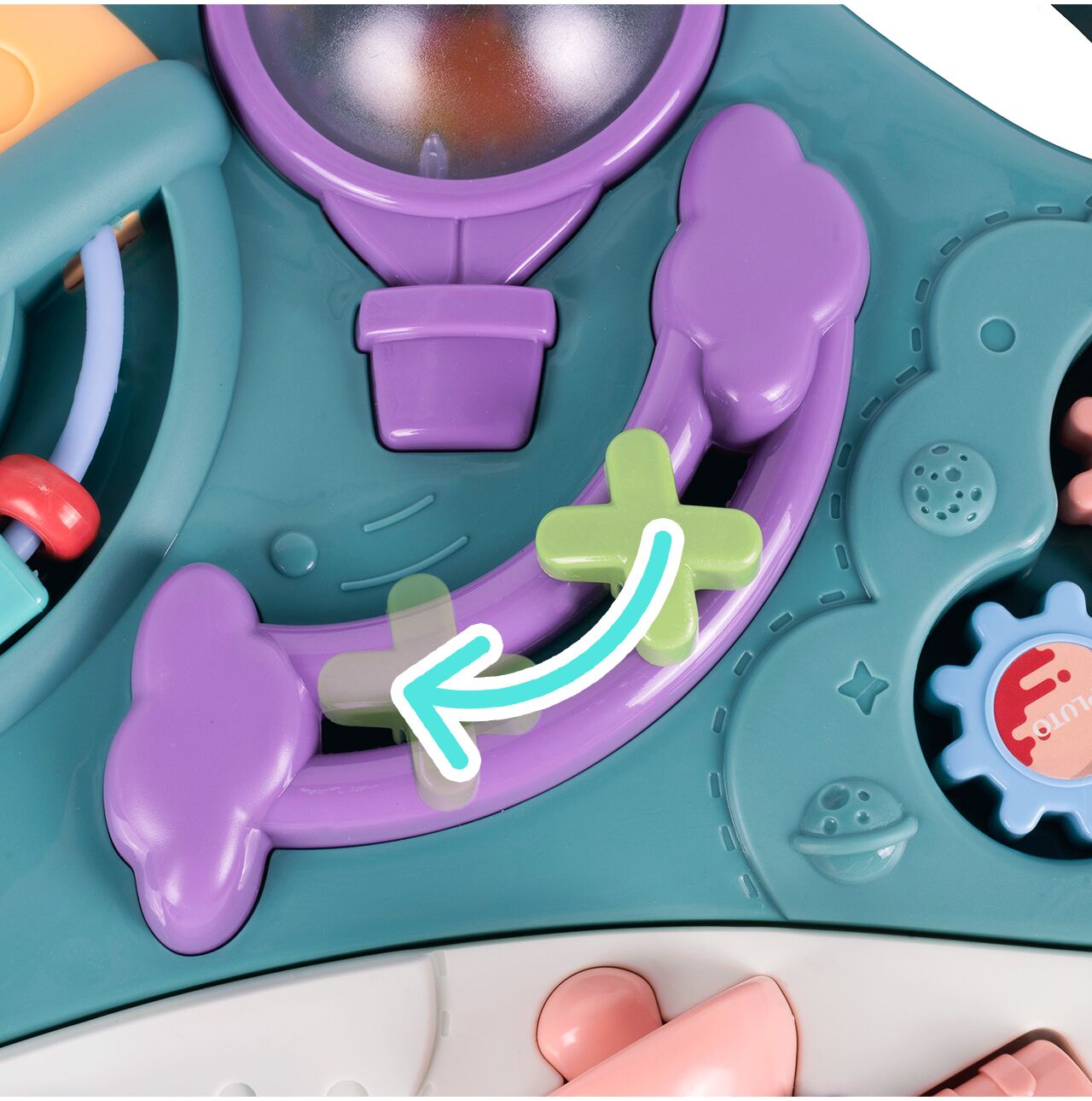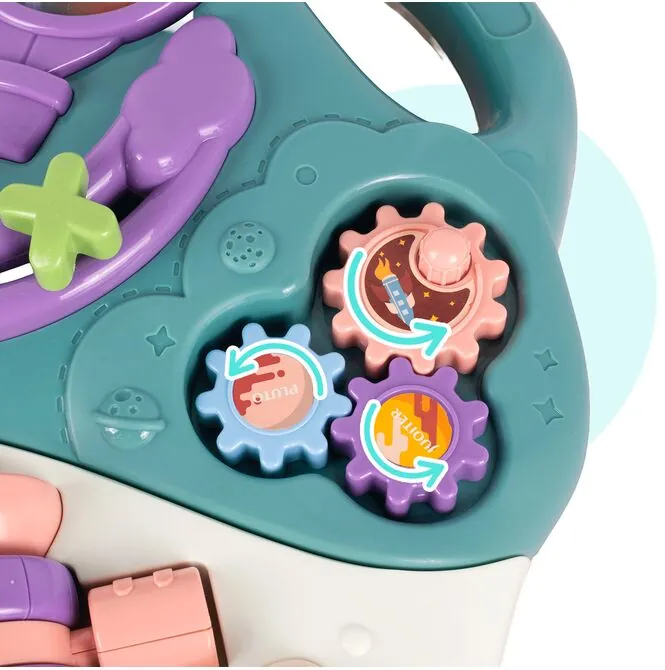Barevný panel s vesmírnými motivy povzbuzuje k mačkání, otáčení a klouzání, což batolatům pomáhá rozvíjet ruce, prsty a koordinaci.