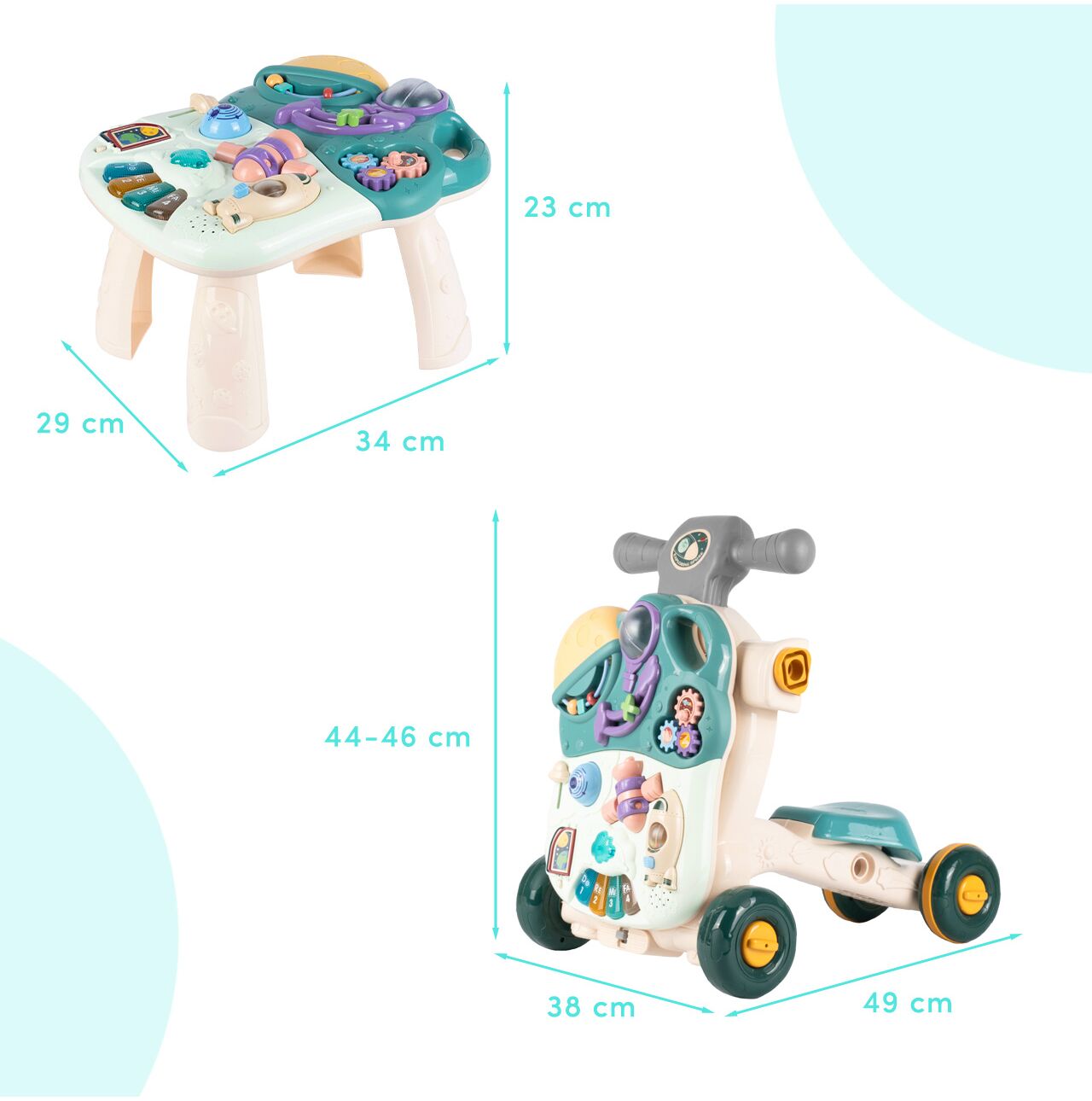 • Funkce: chodítko, odrážedlo, stolek s aktivitami, panel s aktivitami