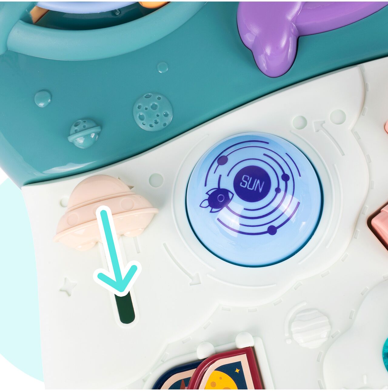 Kosmické detaily, posuvné okénko a otočné části podněcují zvědavost a povzbuzují děti k tomu, aby samy objevovaly funkce hračky.