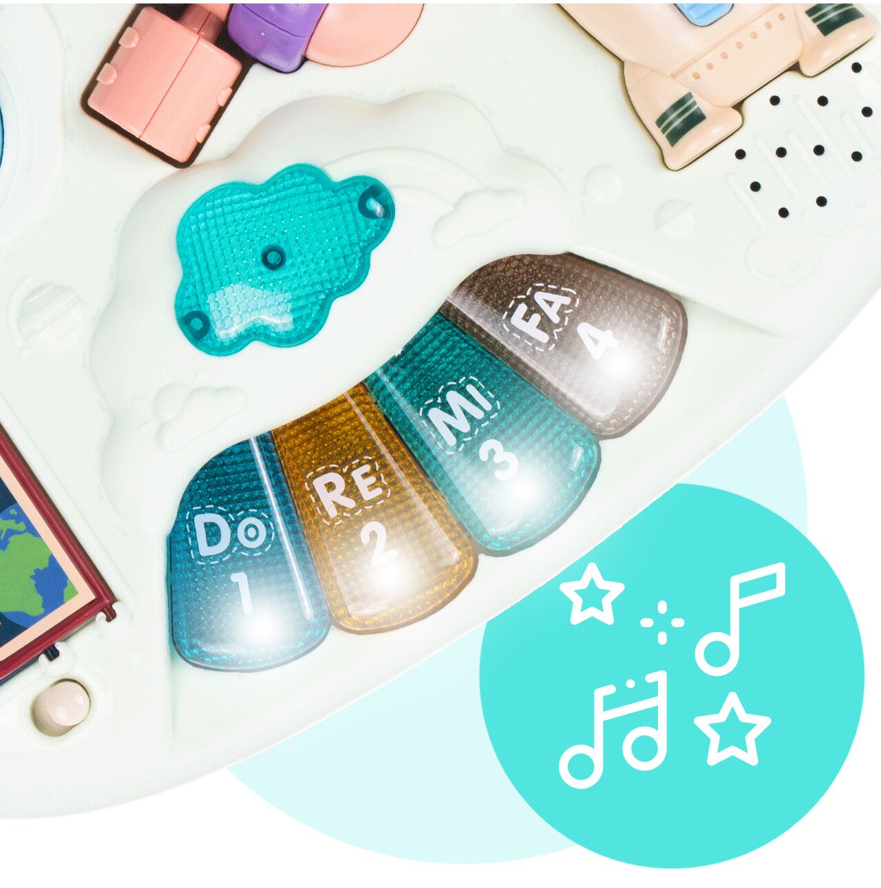 Barevné klávesy dodávají interaktivní nádech a dělají panel ještě poutavějším. Batolata se učí barvy a užívají si pohyb a zvuk.