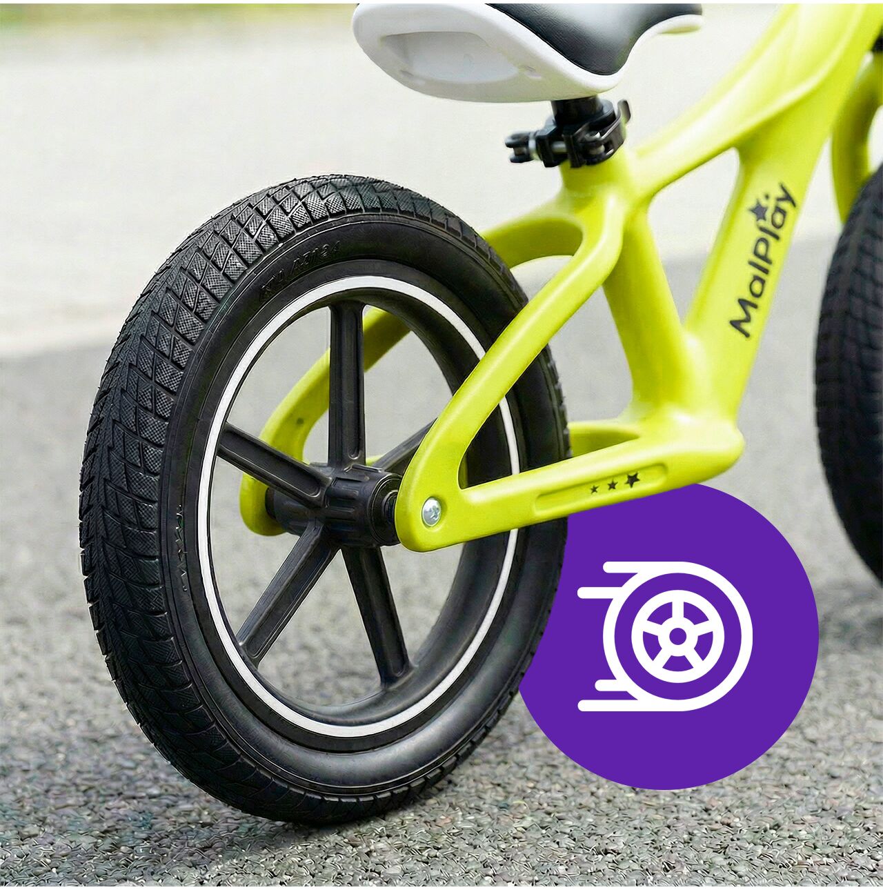 Díky tomu kolo váží pouze 3,4 kg – pro dítě je snazší udržet rovnováhu a vy nemusíte po hřišti nosit 6–7 kg kovu.