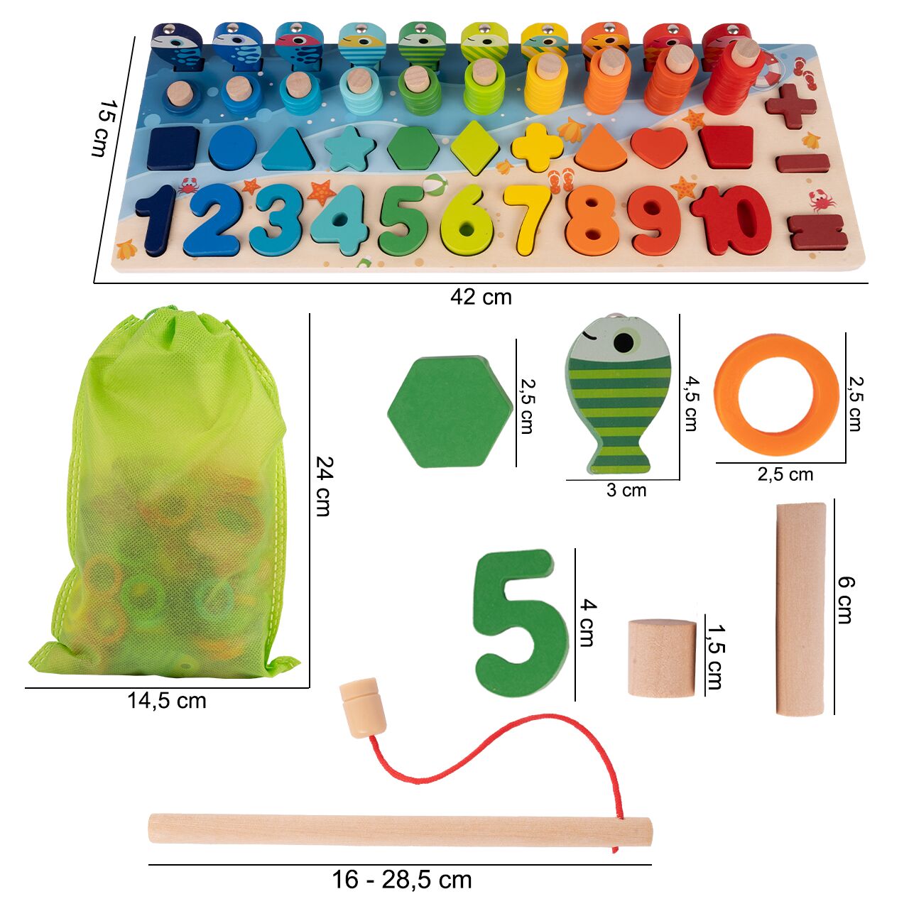 Pokúste sa chytiť všetky ryby pomocou dreveného rybárskeho prútu. Hračka stimuluje zrakovú a motorickú koordináciu vášho dieťaťa.