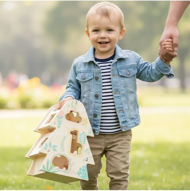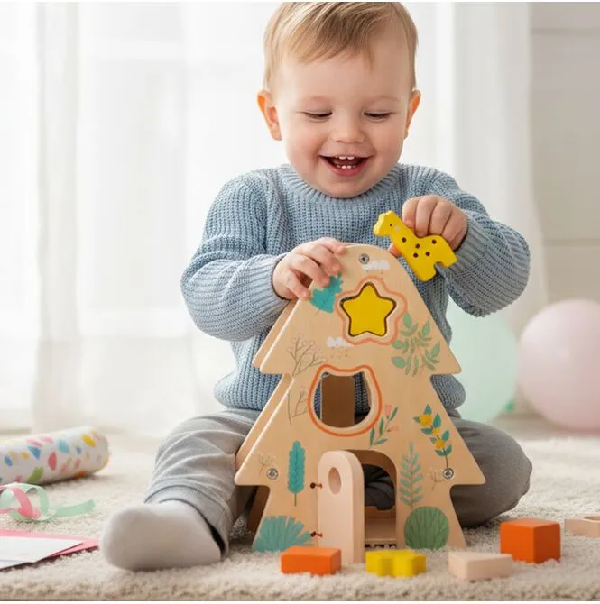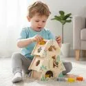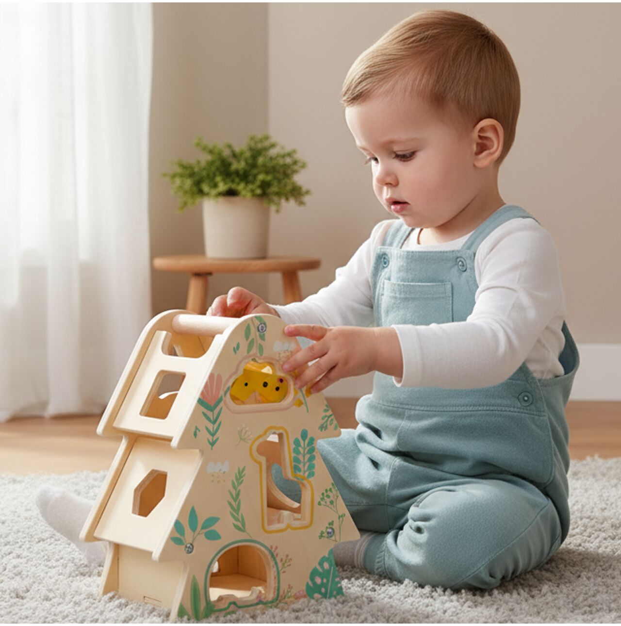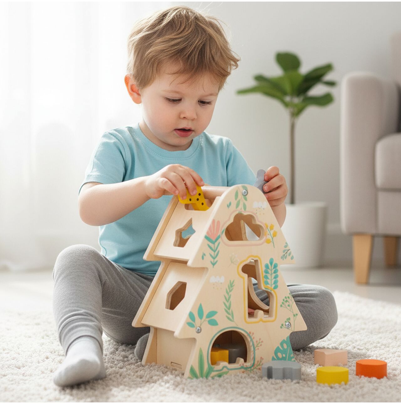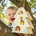 • Leśne drzewko–domek pełen zadań – dziecko dopasowuje klocki do otworów, chowa zwierzątka w środku i odkrywa kolejne niespodzianki.