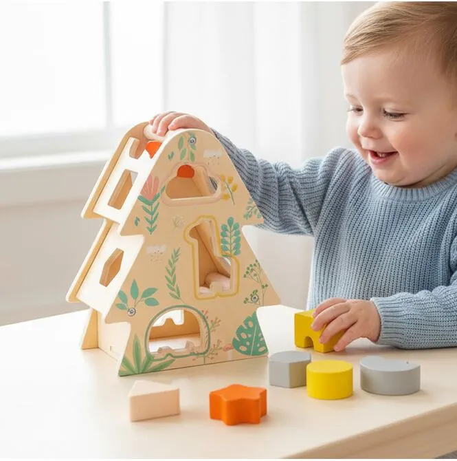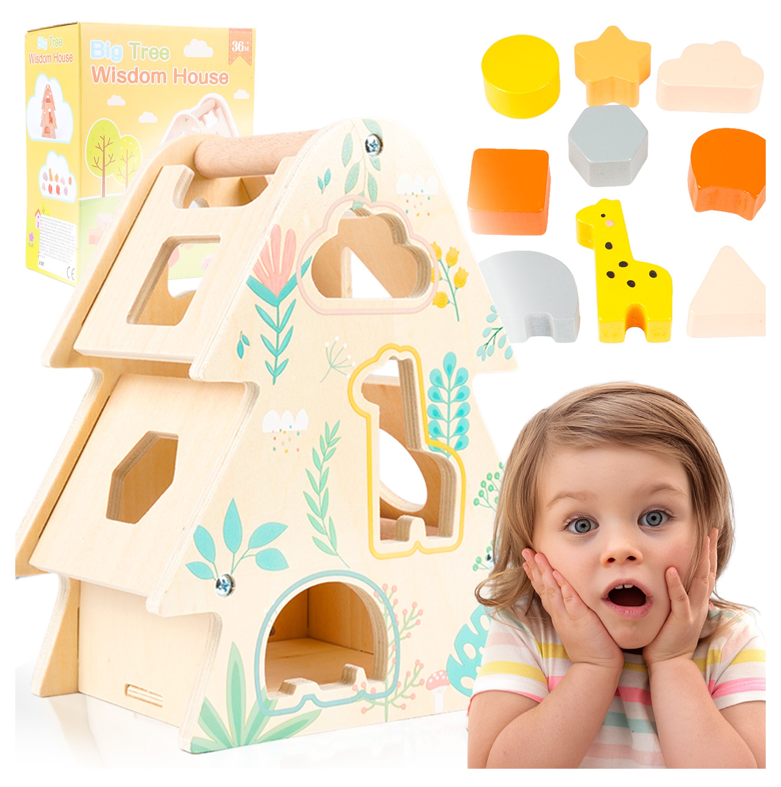 DREWNIANA UKŁADANKA EDUKACYJNA SORTER KSZTAŁTÓW DOMEK DRZEWKO CHOINKA