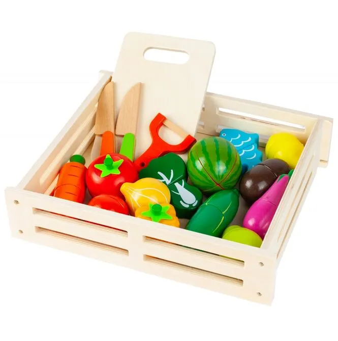 Zestaw kolorowych warzyw i owoców w skrzyneczce to świetne dopełnienie zabawy dla małych kucharzy, którzy uwielbiają bawić się w dom, sklep czy gotowanie.