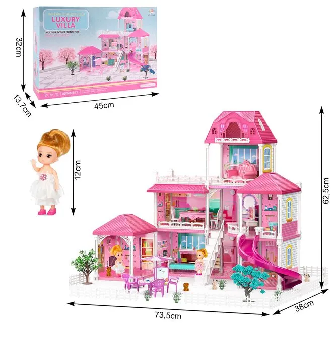 DUŻY DOMEK DLA LALEK VILLA ROZKŁADANY MEBELKI FIGURKI TARAS PIESKI XXL
