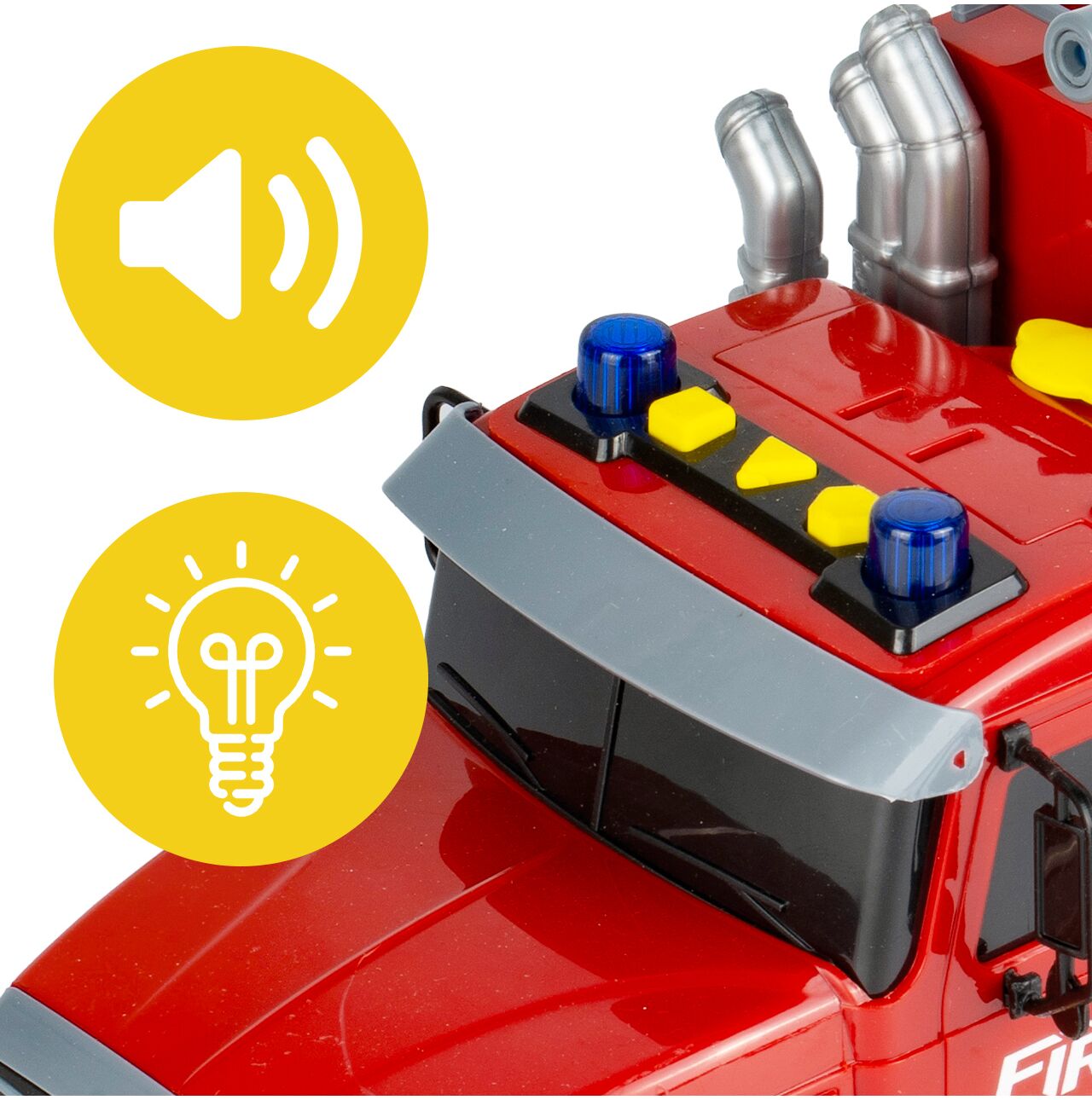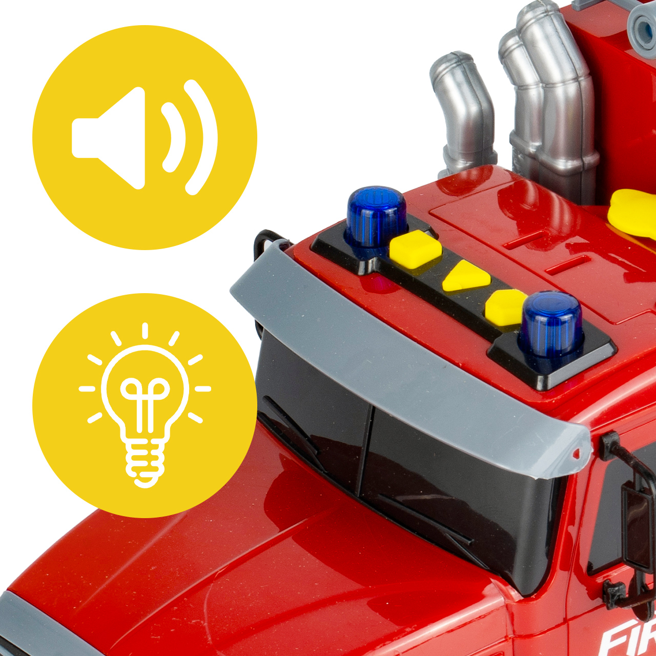 Střecha kabiny je vybavena majáky a hračka také spouští zvukové efekty , které napodobují skutečné záchranné vozidlo. To umožňuje dětem zažít atmosféru hasičské operace pouhým stisknutím tlačítka. Světla a zvuky výrazně zvyšují realističnost zážitku, přitahují pozornost a dělají z vozidla více než jen jednoduchý model na tlačení.