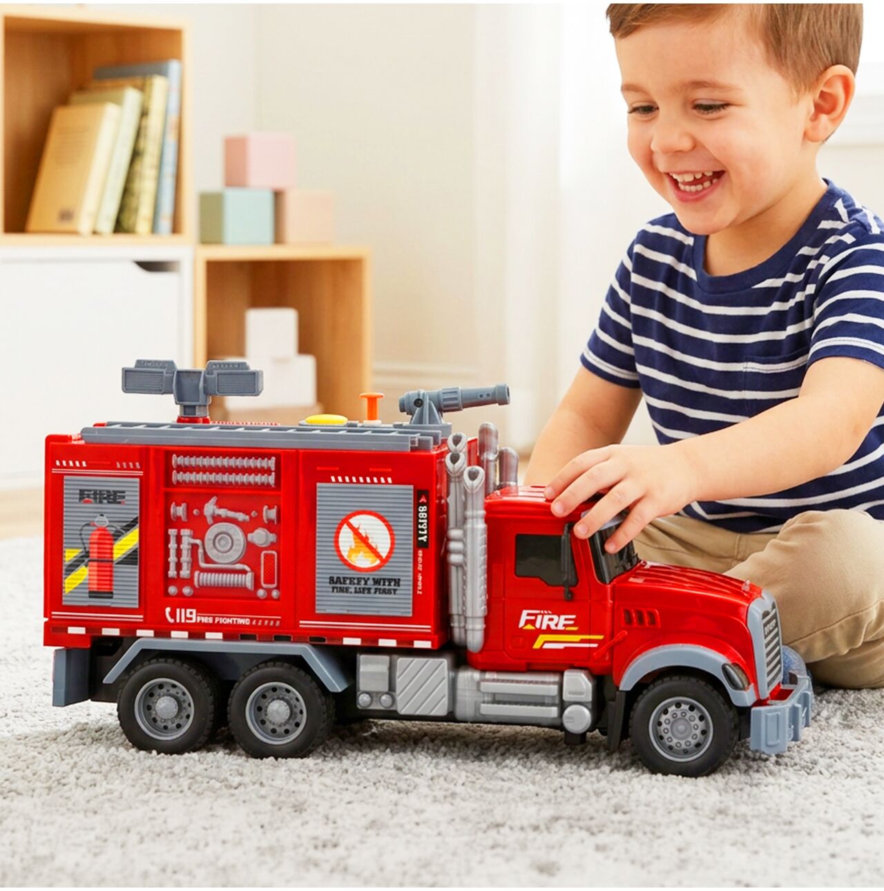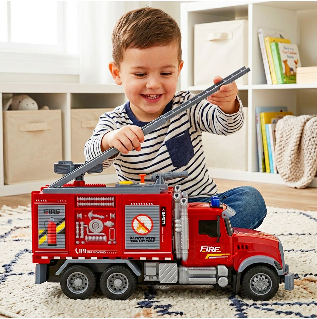 Vozidlo nabízí mnohem víc než jen jednoduchý exteriér. Střecha je vybavena vodním dělem, žebříkem, funkčními tlačítky a semafory , to vše je navrženo tak, aby připomínalo skutečné hasičské auto. To dětem umožňuje nejen se ve vozidle svézt, ale také si zahrát plnohodnotnou záchrannou operaci.