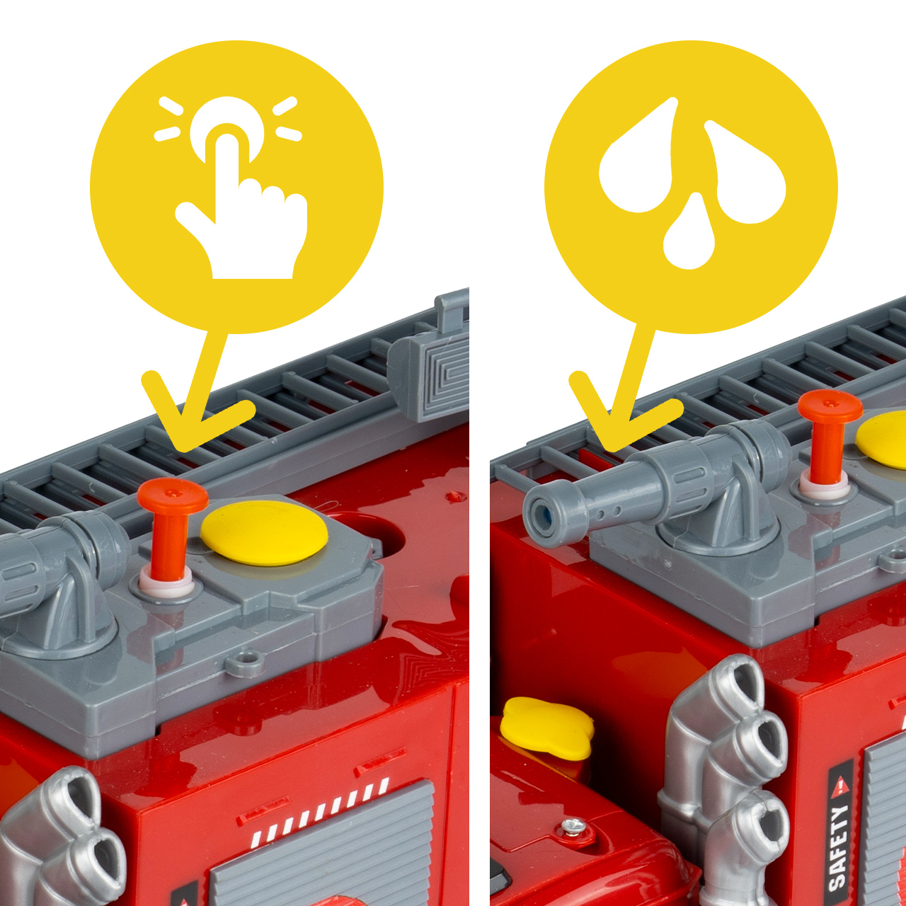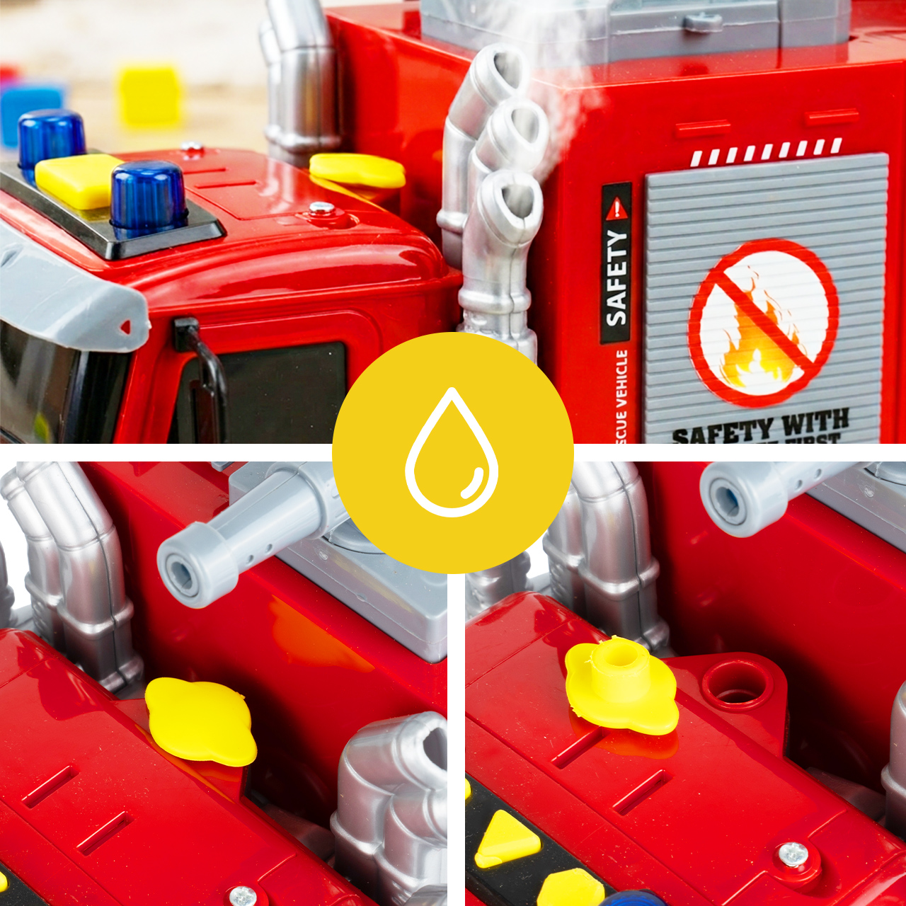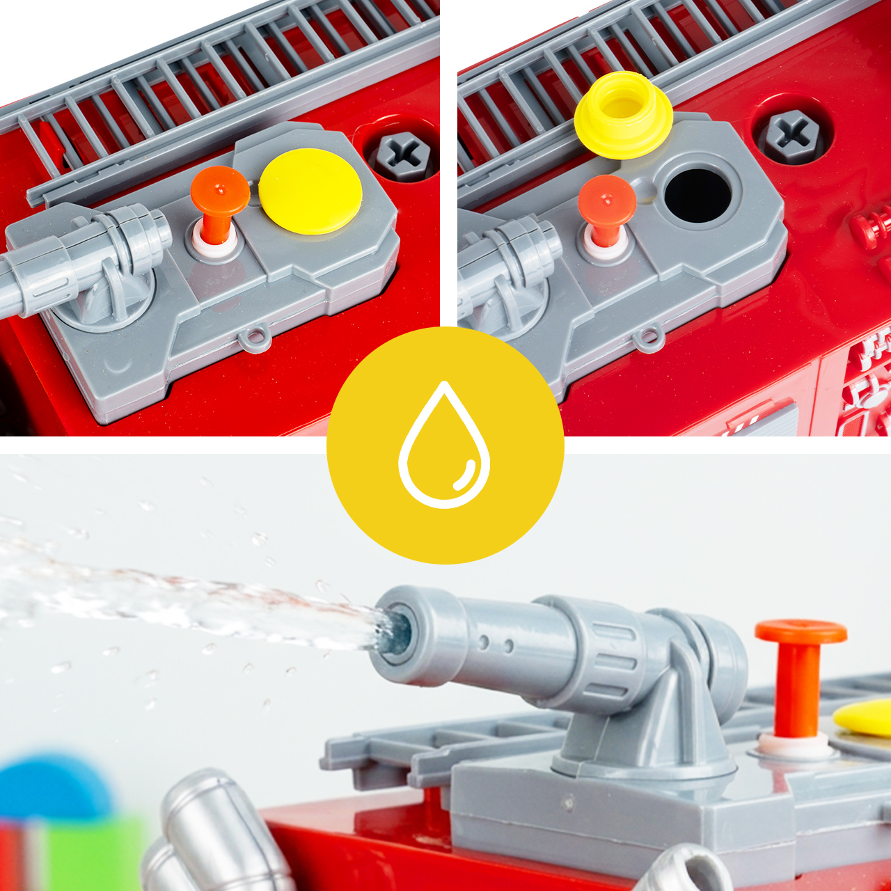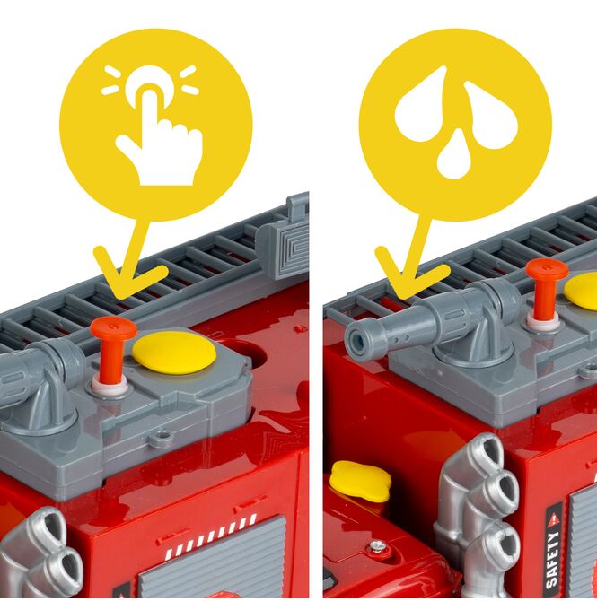 Na střeše vozidla se nachází kanón, který po naplnění nádrže stříká vodu . Stačí odšroubovat žlutý uzávěr, nalít vodu do nádrže a aktivovat mechanismus, což dětem umožní hrát si na hašení požáru ještě realističtějším způsobem. Tato vlastnost je to, co tuto hračku skutečně odlišuje, protože poskytuje efekt reálného světa, nejen vizuální efekt.