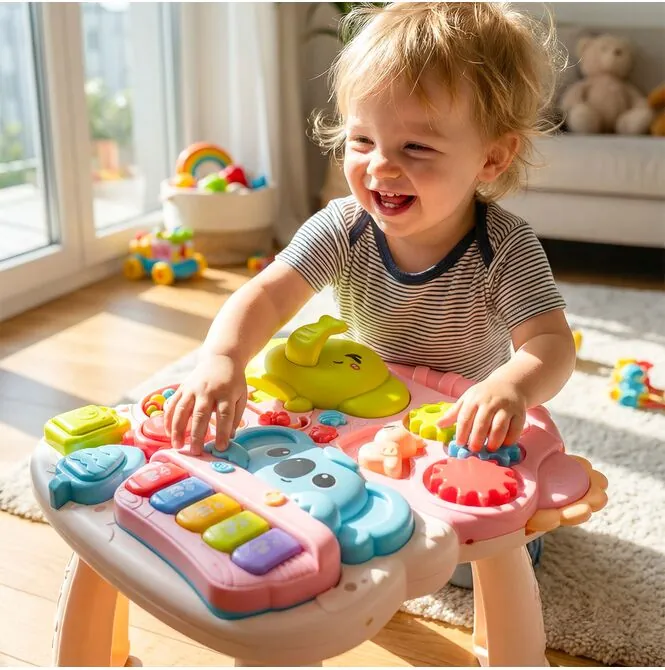 Vestavěné piano s barevnými klávesami poskytuje spoustu zábavy a pomáhá rozvíjet sluch, rytmus a hudební citlivost. Děti mohou samostatně mačkat tlačítka, objevovat zvuky a bavit se vytvářením vlastních prvních melodií.