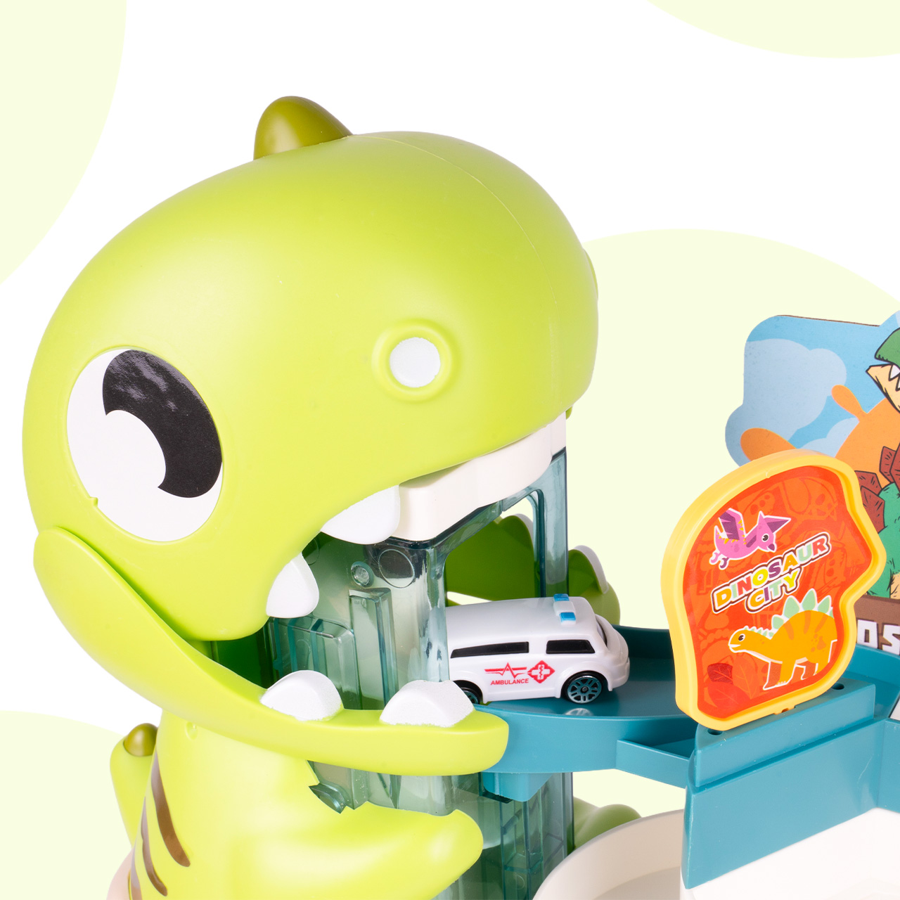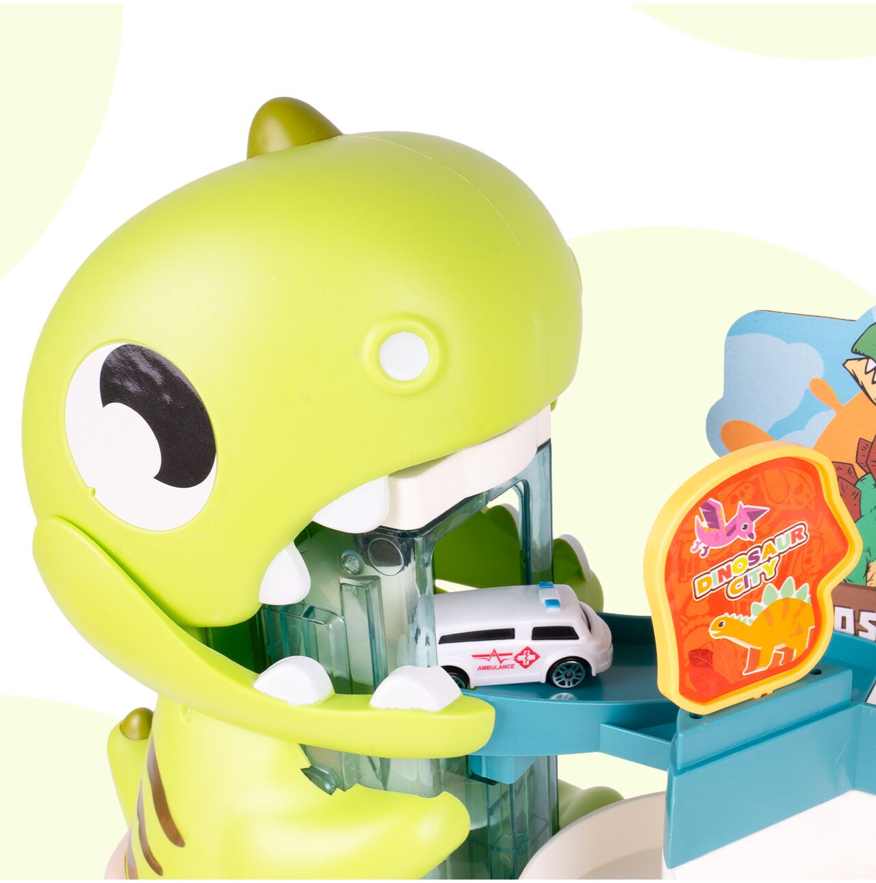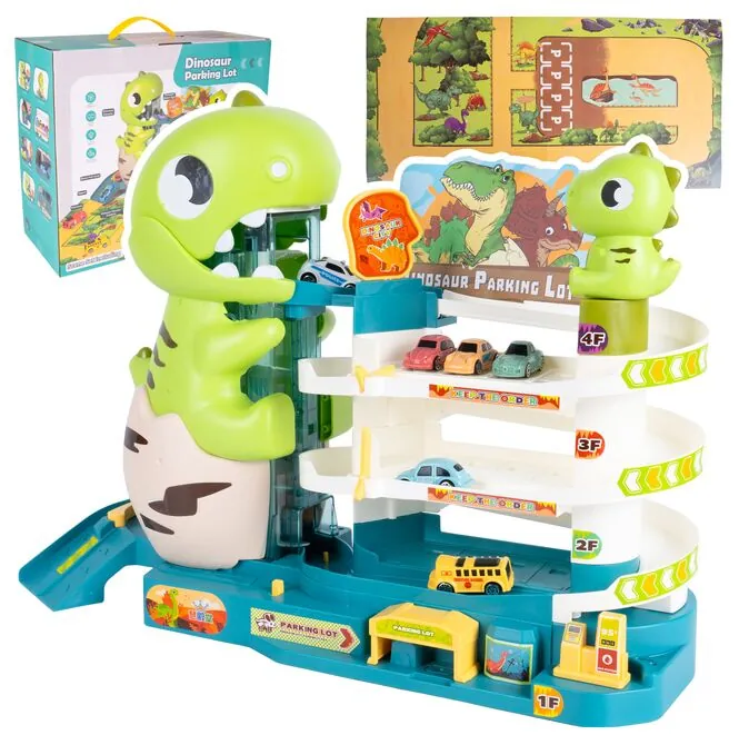 Tohle není jen tak obyčejná garáž pro autíčka. Velká figurka dinosaura okamžitě upoutá pozornost a vytváří jedinečnou herní atmosféru. Vícepodlažní parkovací garáž zasazená do prehistorického parku podněcuje dětskou fantazii a umožňuje každému autu vydat se na novou cestu světem dinosaurů.