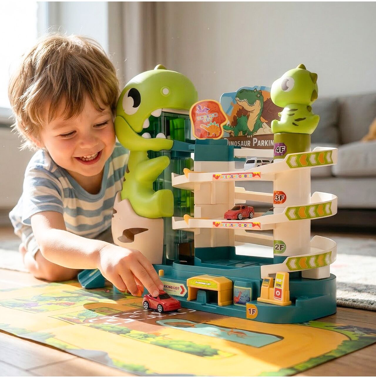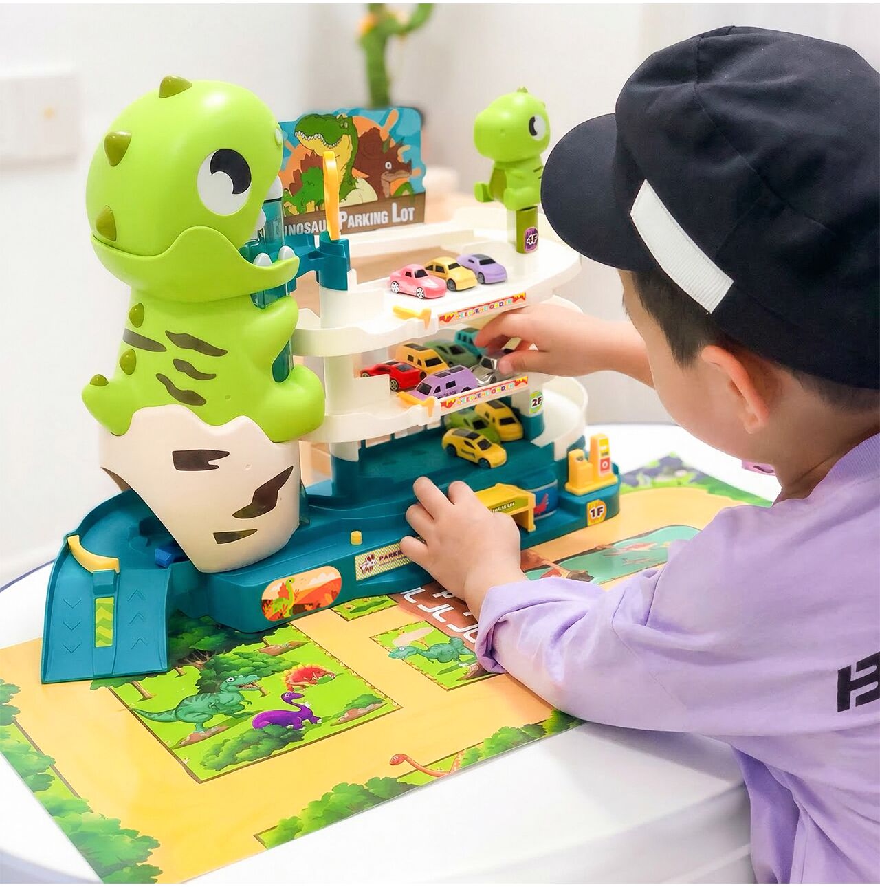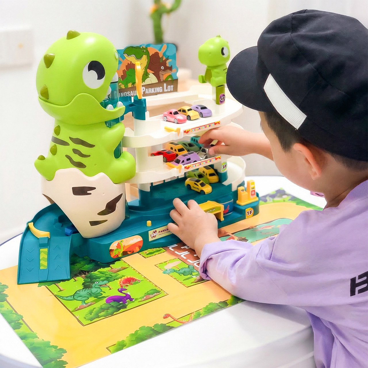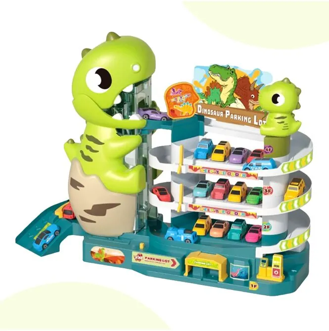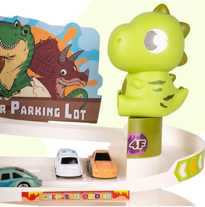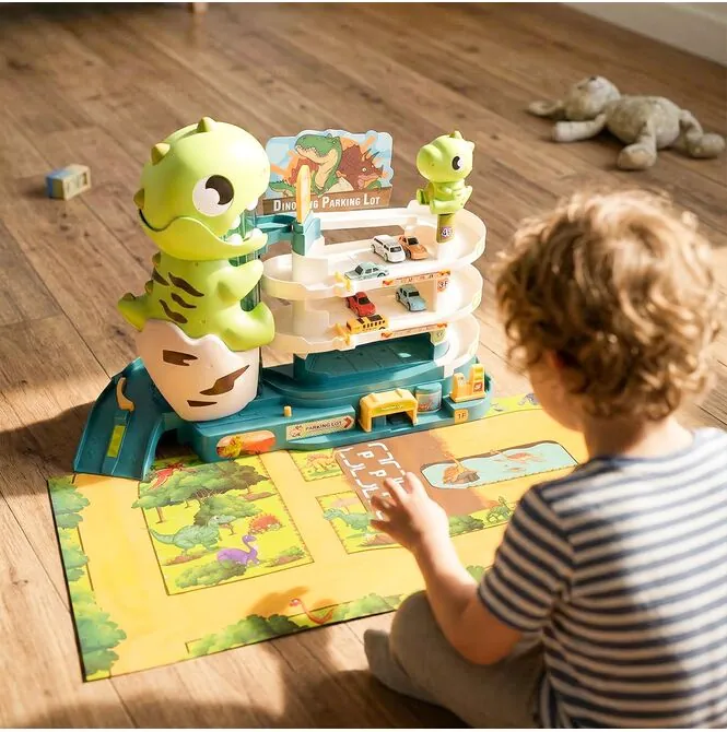 - Vícepatrové parkoviště s motivem dinosaura – působivý design přitahuje pozornost a okamžitě povzbuzuje děti ke hře.
