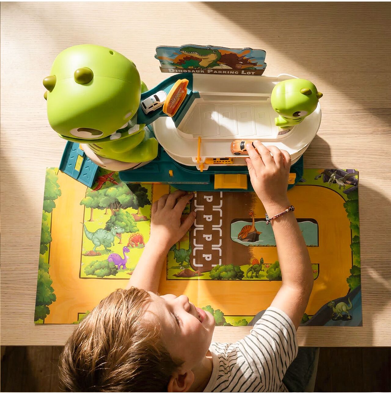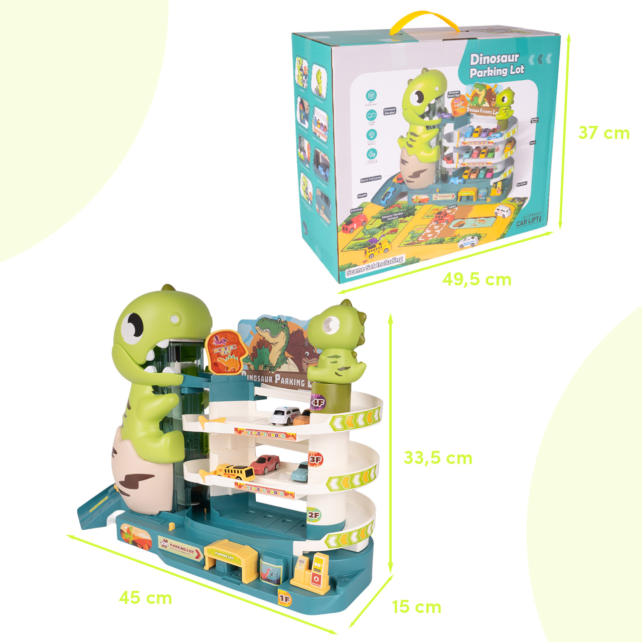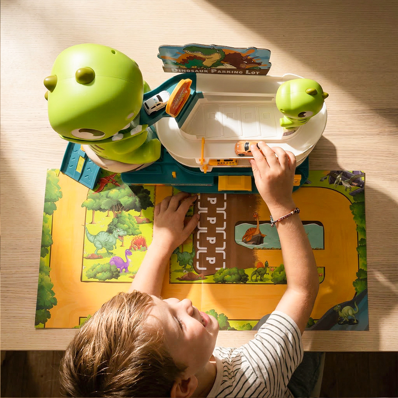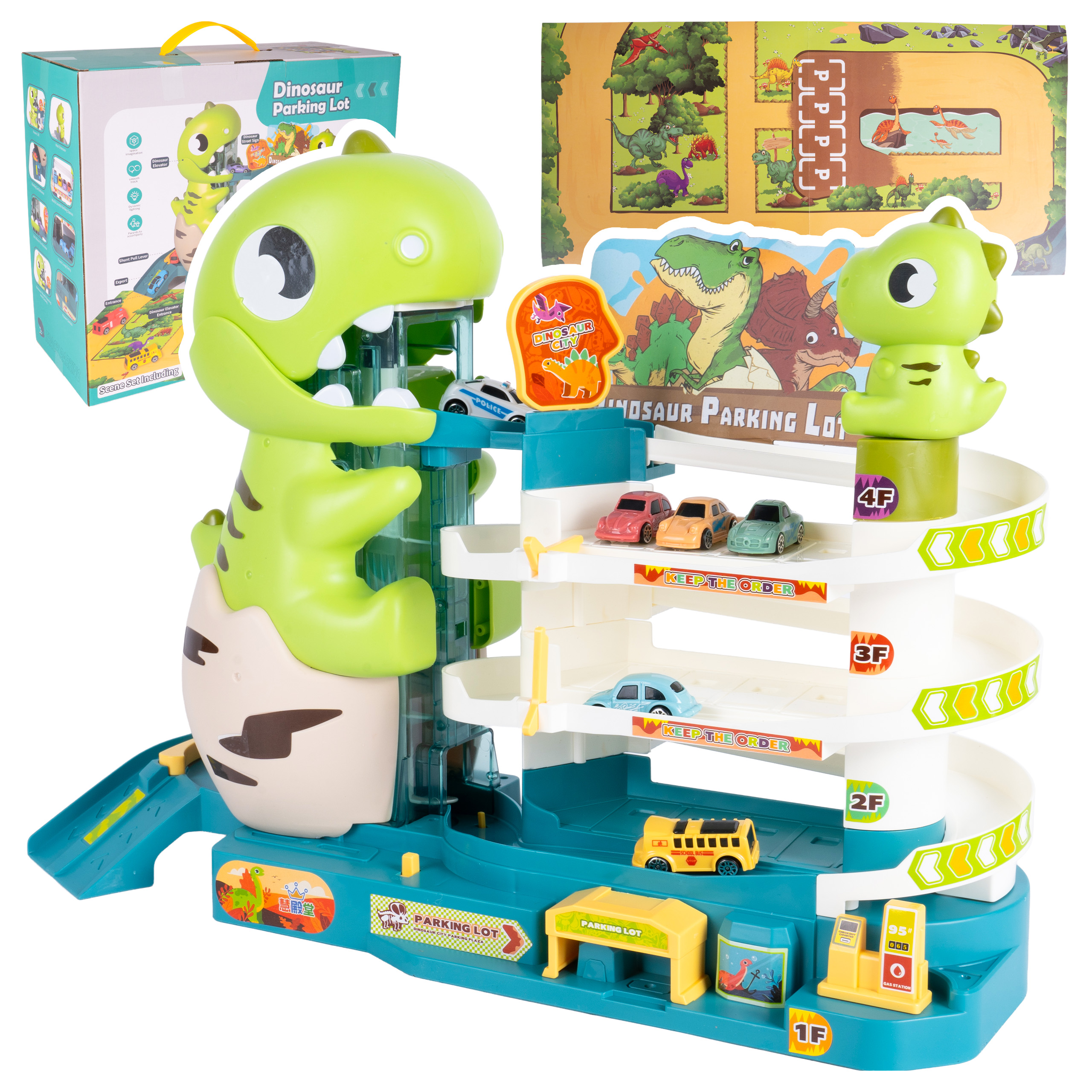 Sada obsahuje tematickou hrací podložku , která rozšiřuje herní plochu a umožňuje ještě napínavější scénáře. Děti si tak mohou hrát nejen na samotném parkovišti, ale i v jeho okolí, stavět si vlastní trasy, odpočívadla a malý svět dinosaurů.