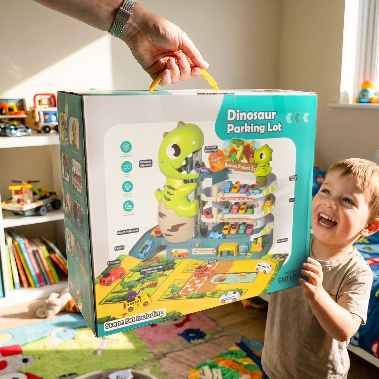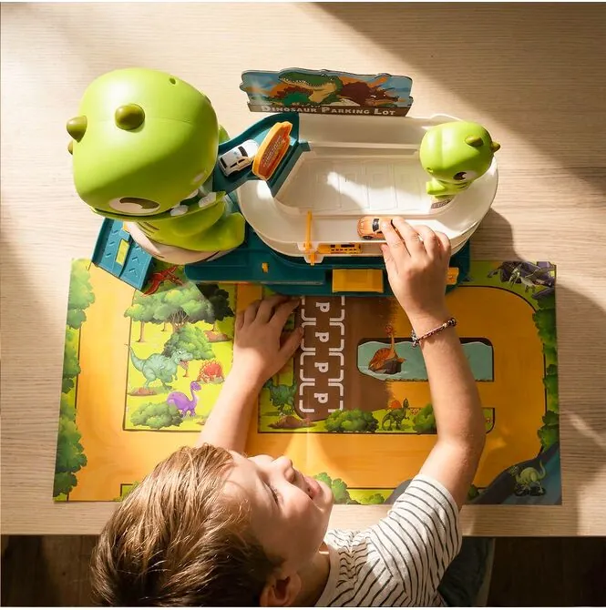 Největším lákadlem sady je výtah ukrytý uvnitř figurky dinosaura , který umožňuje přepravu autíček do horních pater parkoviště. Autíčka pak mohou sjet dolů, což dětem poskytuje obrovské uspokojení a povzbuzuje je k opakovanému hraní. Je to jednoduchá, ale poutavá aktivita.