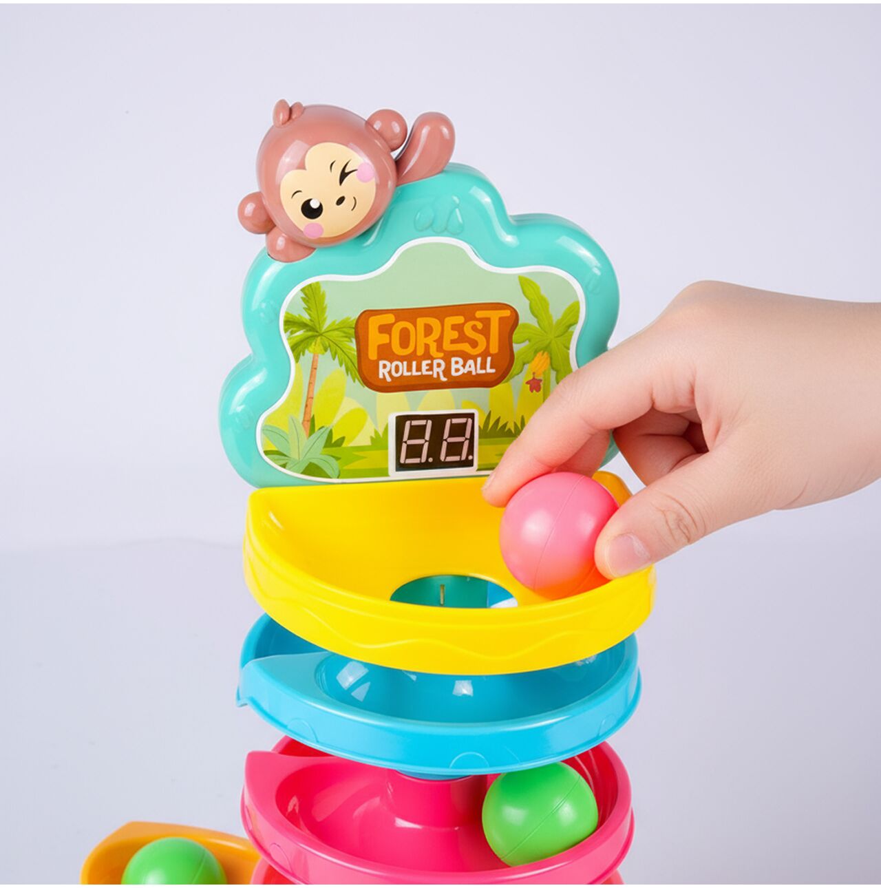 Věž z barevných talířů vytváří dlouhou, velkolepou dráhu . Míč se točí úrovněmi a dítě ho sleduje očima odshora dolů. Tato dráha je nejen zábavná, ale také procvičuje soustředění, vizuální vnímání a očekávání („kde se míč objeví příště?“).