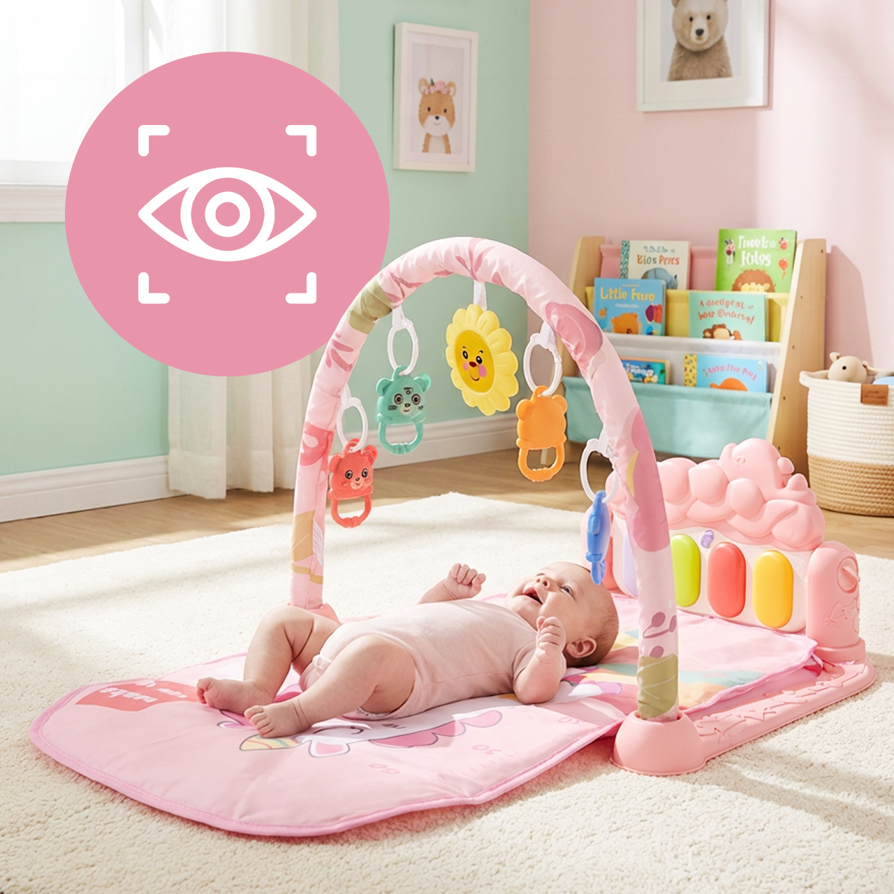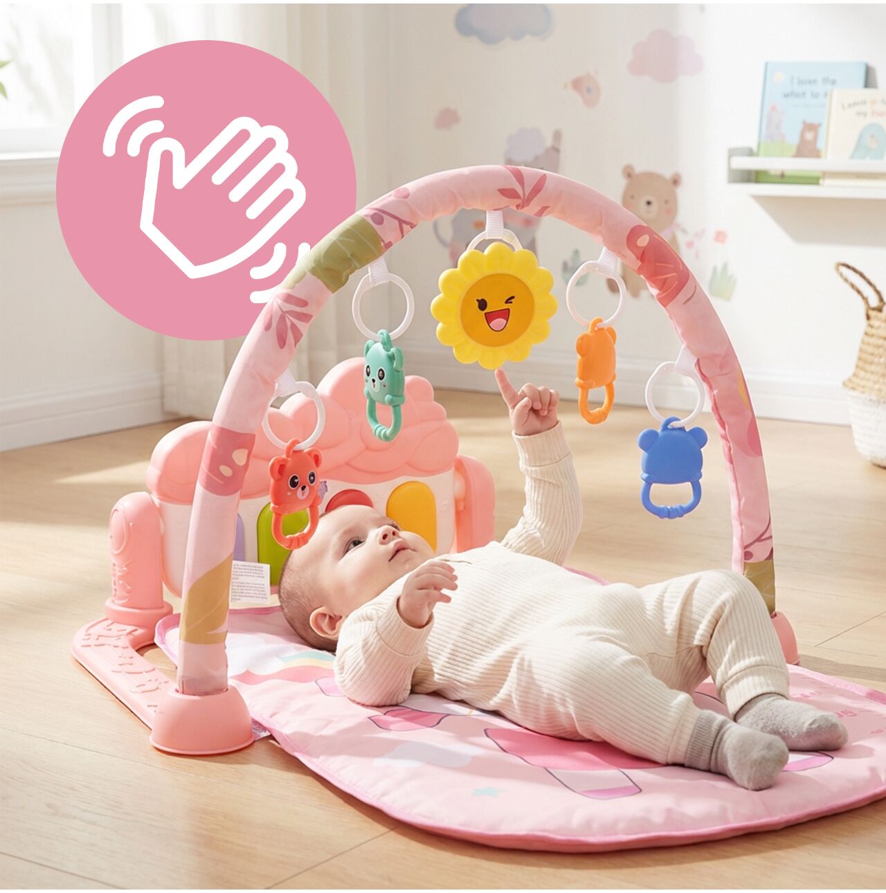 Každý prvek zde má svůj účel. Čtyři odnímatelné hračky lze zkoumat, chytat, třást a přenášet z ruky do ruky, zatímco další přívěsek ve tvaru slunce stimuluje zvědavost a podporuje vizuální soustředění. Nejedná se jen o náhodnou sbírku doplňků – jde o doplňky, které dětem pomáhají procvičovat úchop, pozorování a první reakce na pohyb. Důležité je, že odnímatelné prvky lze také použít k samostatné hře, jakmile je dítě mimo podložku.