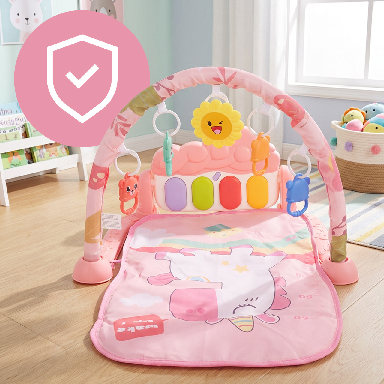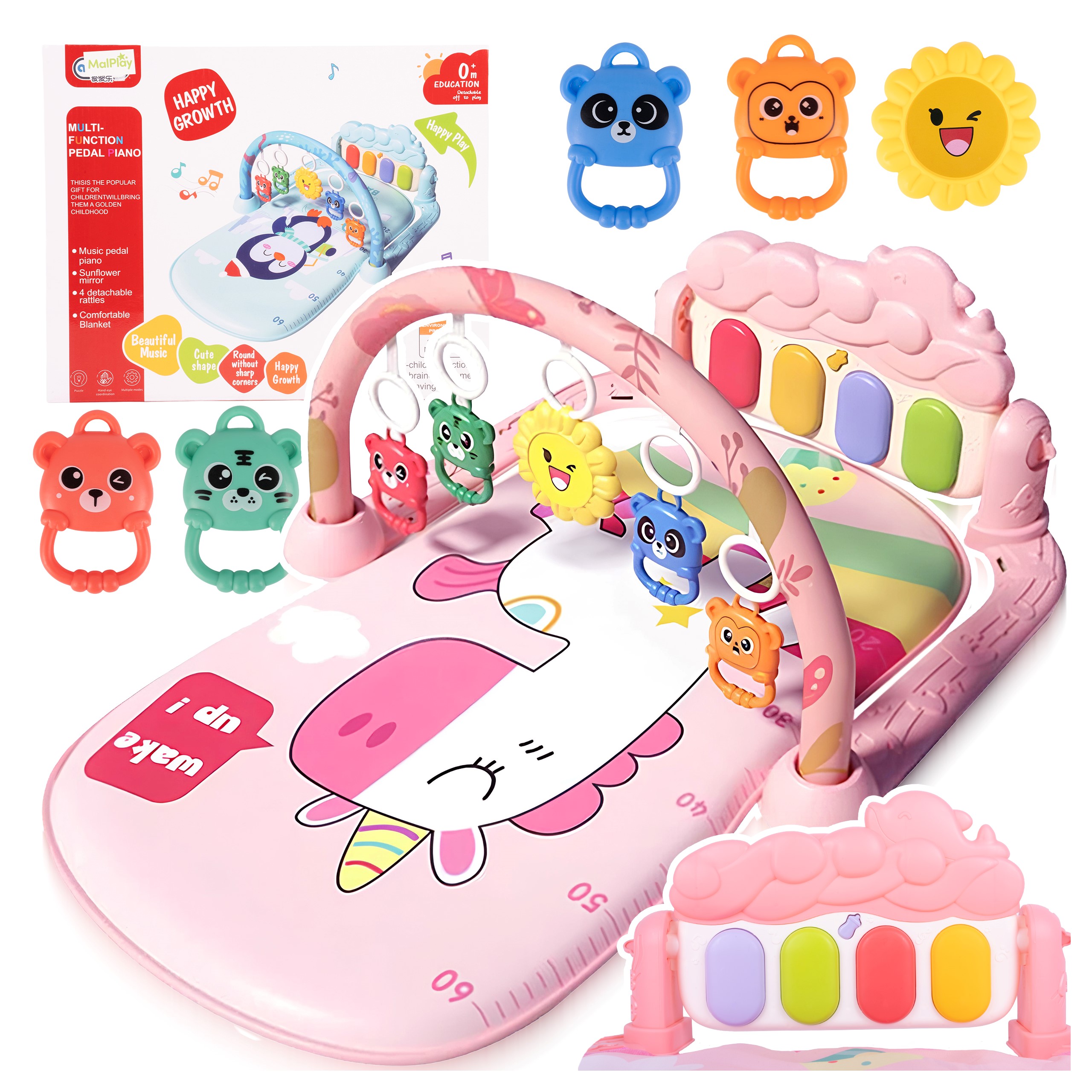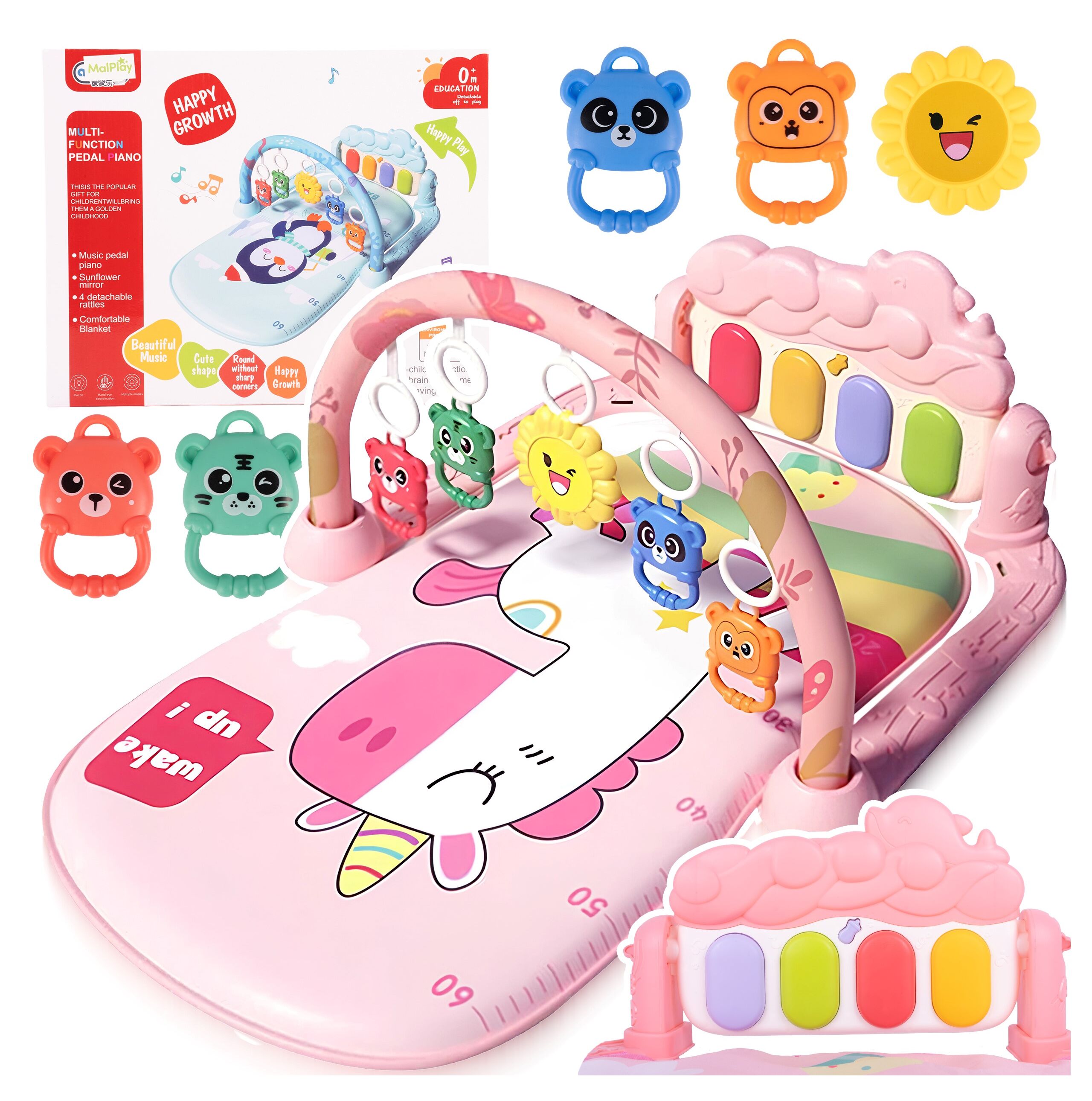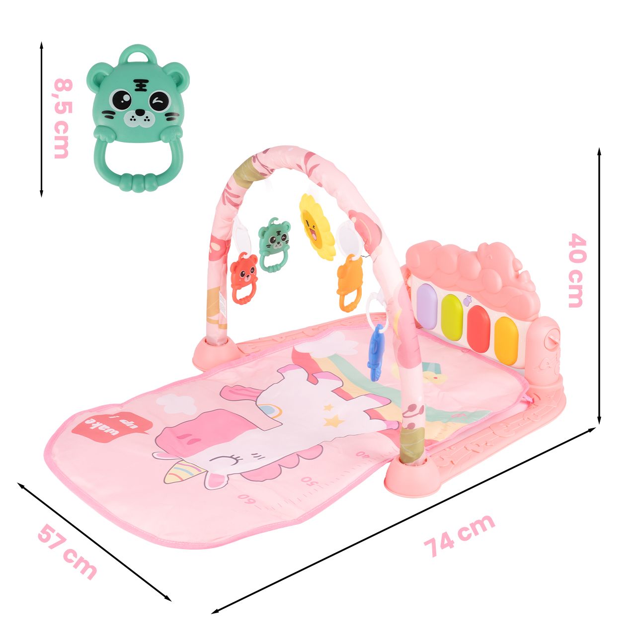 Buďme upřímní – na vzhledu také záleží. Motiv jednorožce, pastelově růžová a příjemné barvy dělají z podložky krásný vzhled v dětském pokoji a skvěle se vyznačují i na fotografiích. Za tímto vzhledem se ale skrývá specifický účel: potisk, barevné klíče, přívěsky a stupnice na podložce nejsou jen dekorativní, ale jsou součástí každodenní hry. Tento produkt kombinuje estetiku s funkčností, takže je perfektním doplňkem dětské výbavy nebo jako dárek.