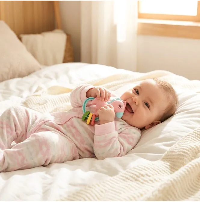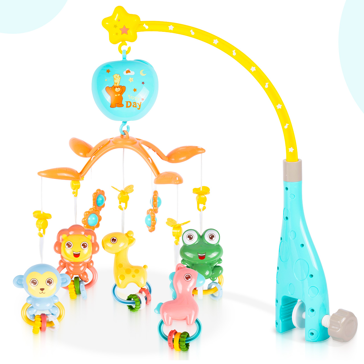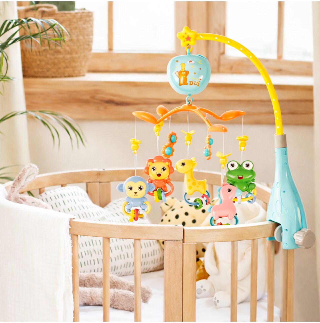 Kolorowe zawieszki ze zwierzątkami (m.in. żyrafka) przyciągają wzrok i zachęcają do interakcji. Dziecko obserwuje, śledzi ruch, reaguje – a Ty zyskujesz chwilę na herbatę, obiad albo szybkie ogarnięcie domu.