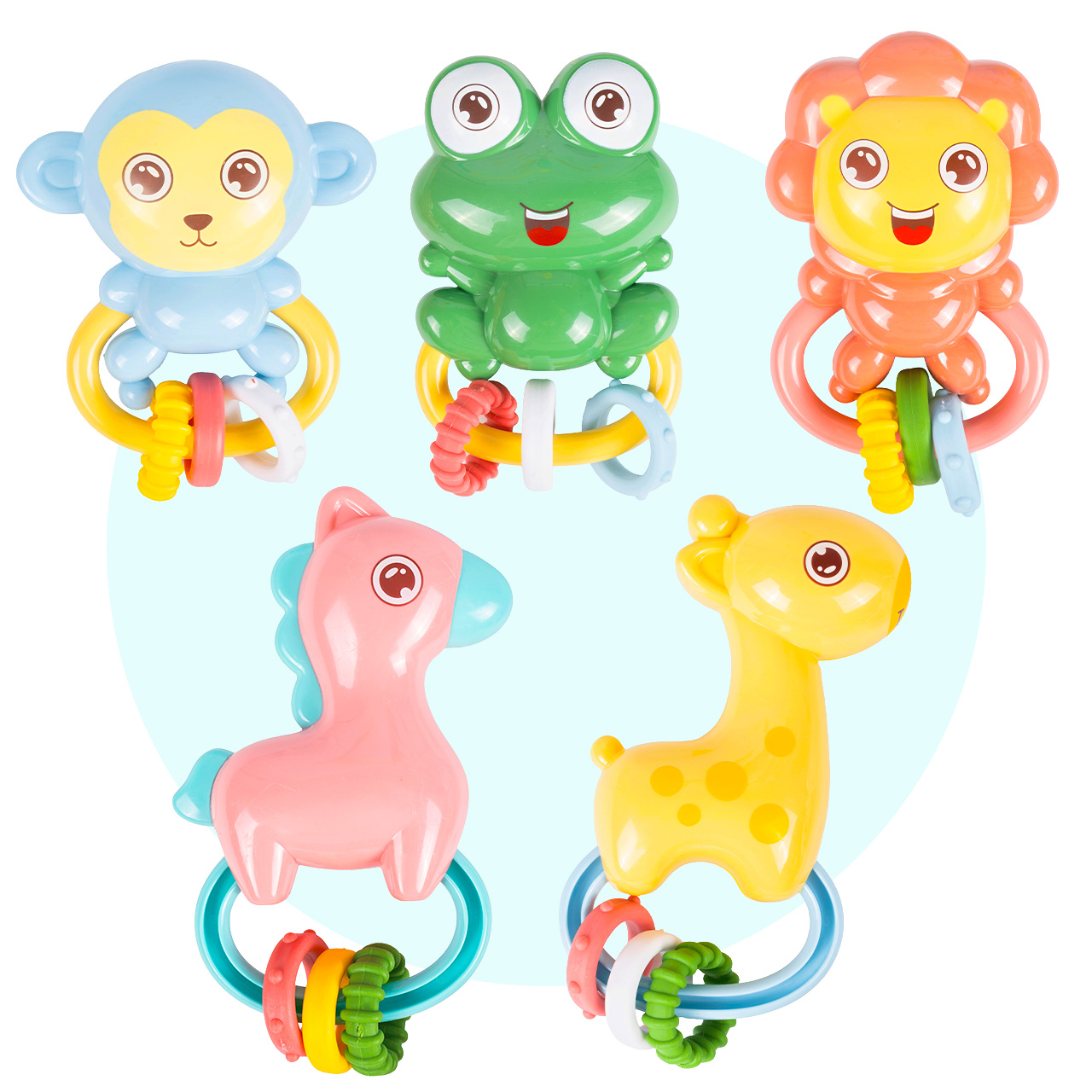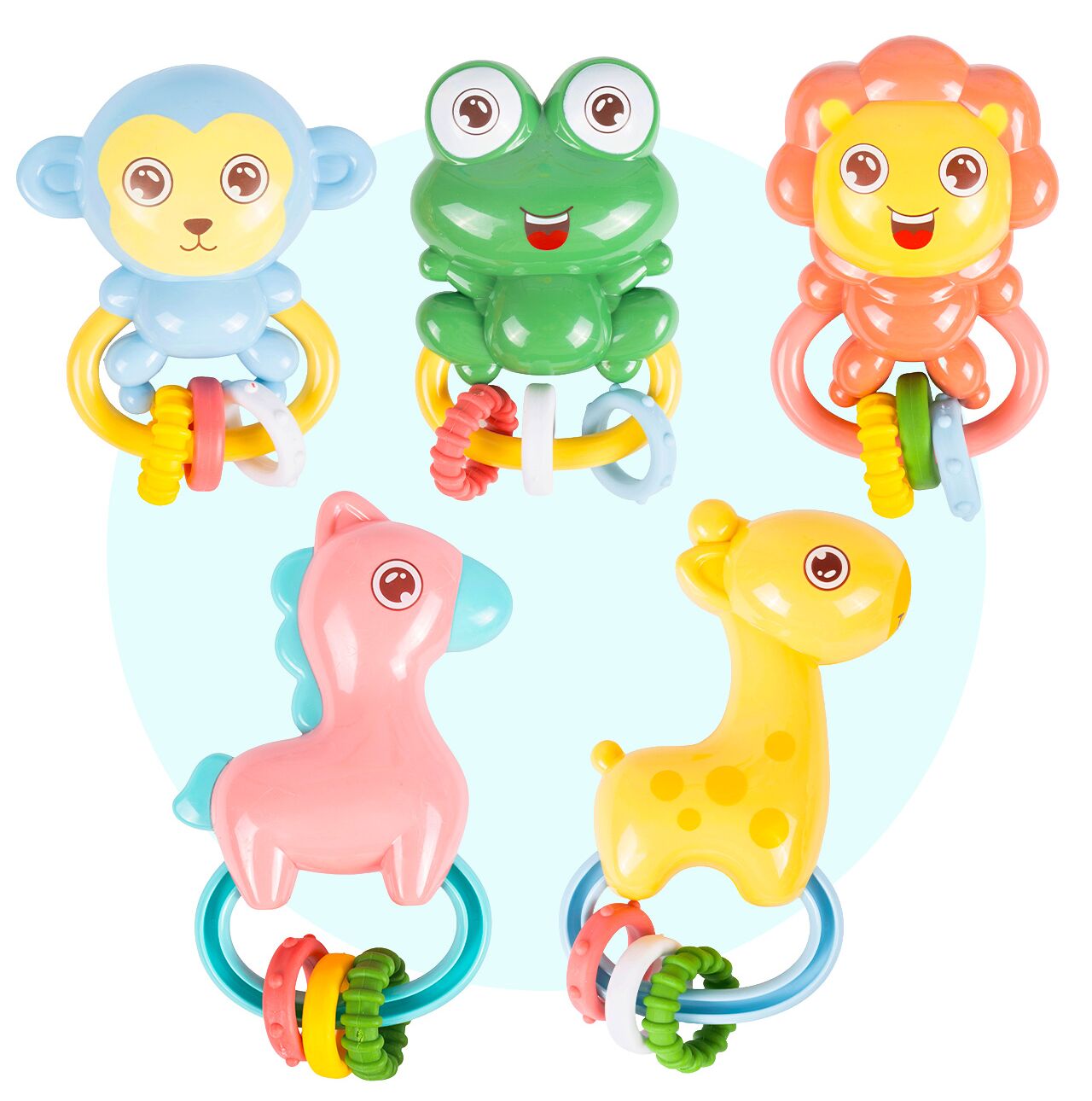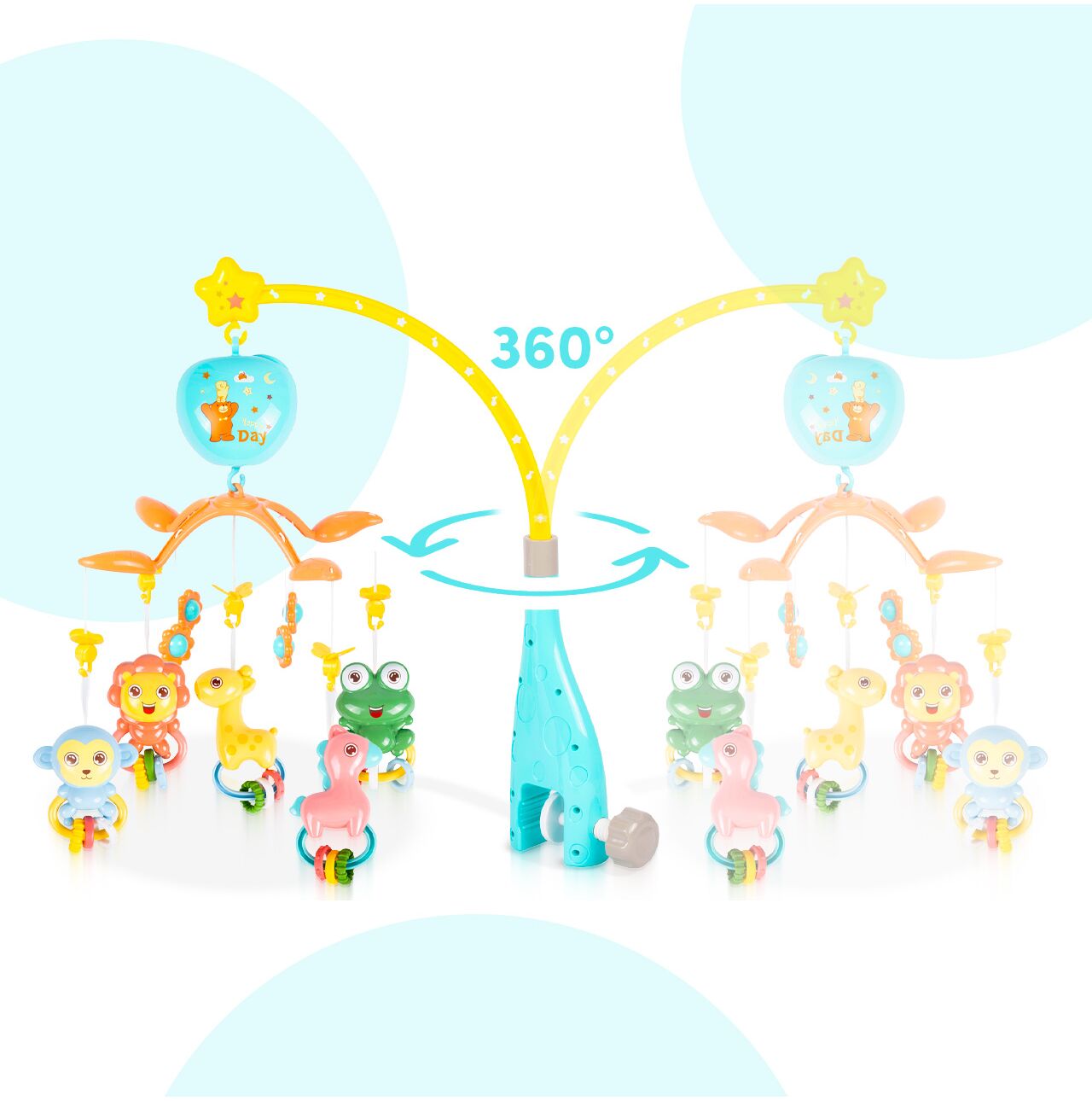 Kolorowe zawieszki ze zwierzątkami (m.in. żyrafka) przyciągają wzrok i zachęcają do interakcji. Dziecko obserwuje, śledzi ruch, reaguje – a Ty zyskujesz chwilę na herbatę, obiad albo szybkie ogarnięcie domu.