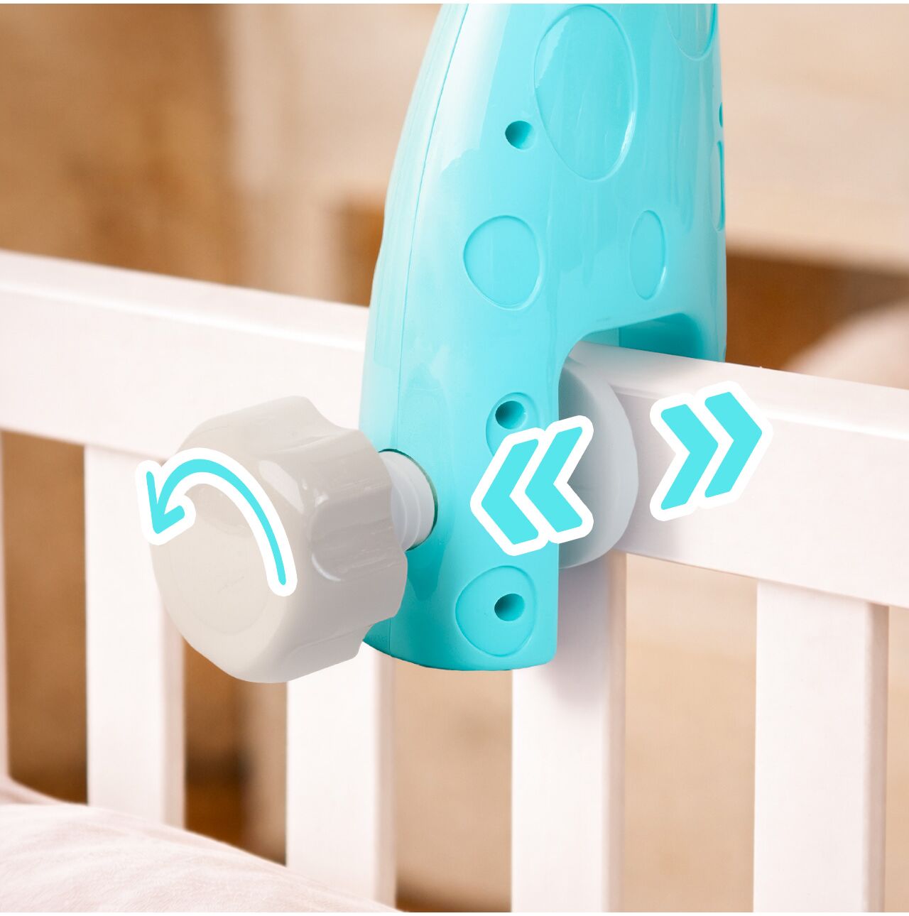 - Stabilny stojak z mocowaniem do łóżeczka – pewne trzymanie, wygodne ustawienie