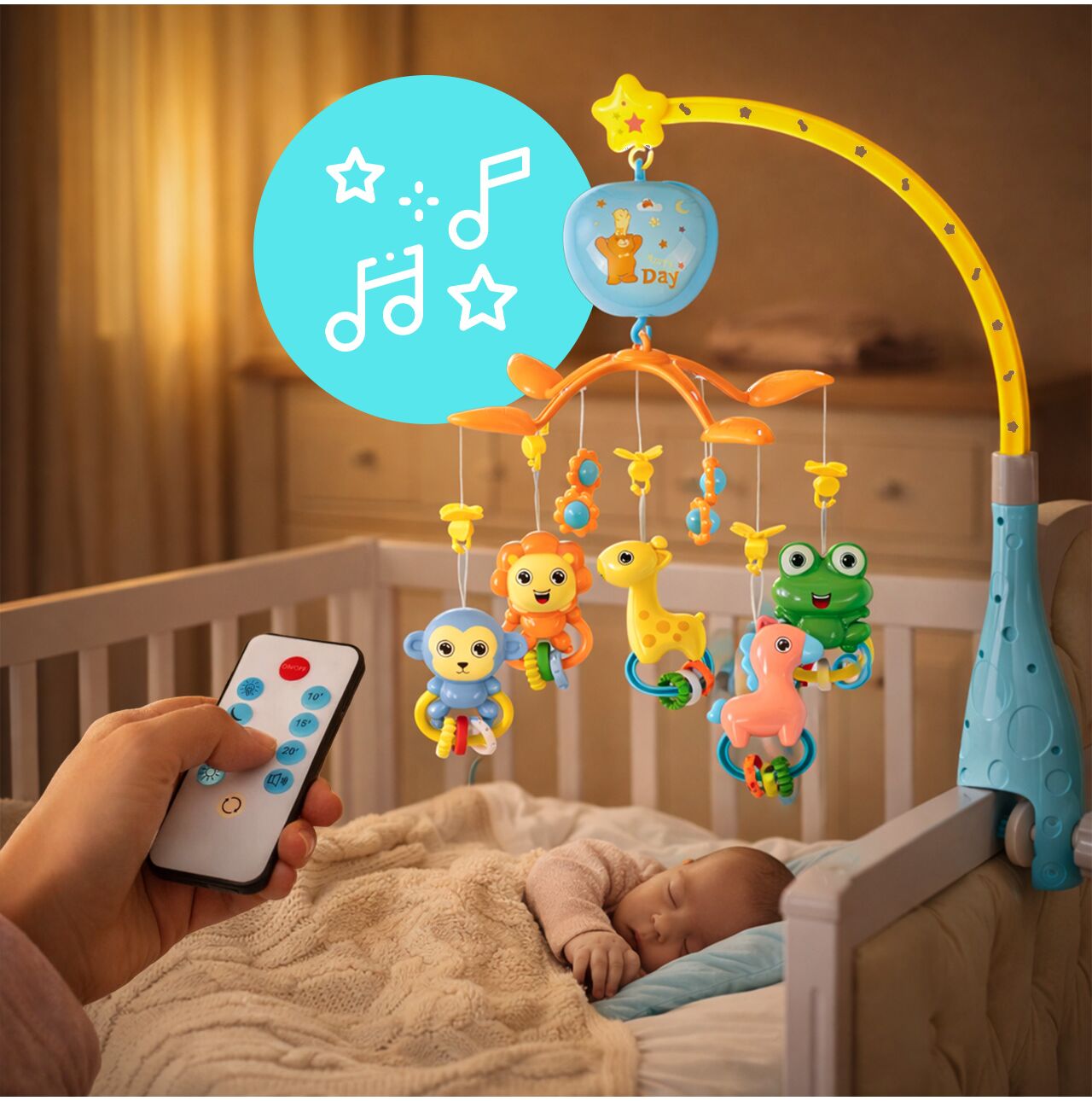 Największy „game changer”? Sterowanie pilotem. Zmieniasz tryb, włączasz/wyłączasz lub dopasowujesz działanie karuzelki bez podchodzenia do łóżeczka – czyli bez ryzyka, że maluch się rozbudzi w najlepszym momencie.