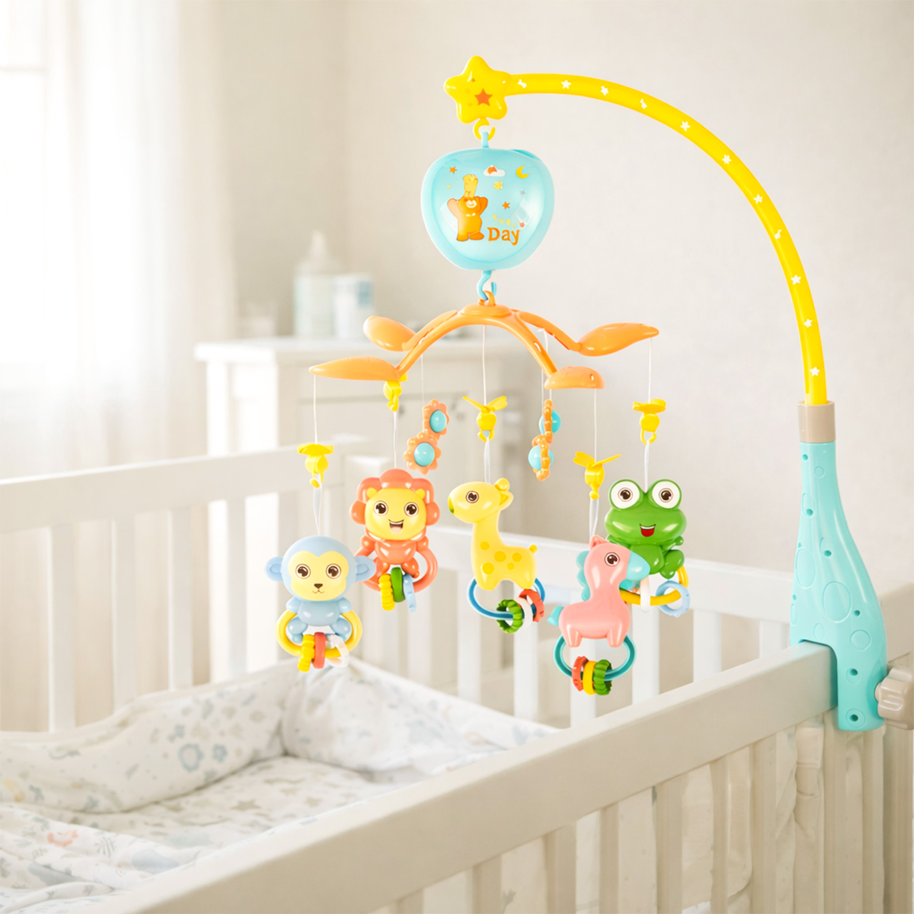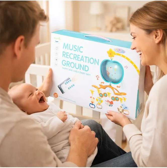Karuzelka wspiera rozwój przez zabawę: wzrok (ruch i kolory), słuch (melodie), koordynację (sięganie i chwytanie). To nie jest tylko ozdoba – to codzienna dawka bodźców podana w łagodnej formie.