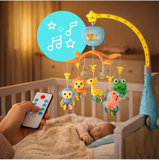 KARUZELKA DO ŁÓŻECZKA Z PILOTEM 6M+ MUZYCZNA POZYTYWKA OBRACANE ZWIERZĄTKA