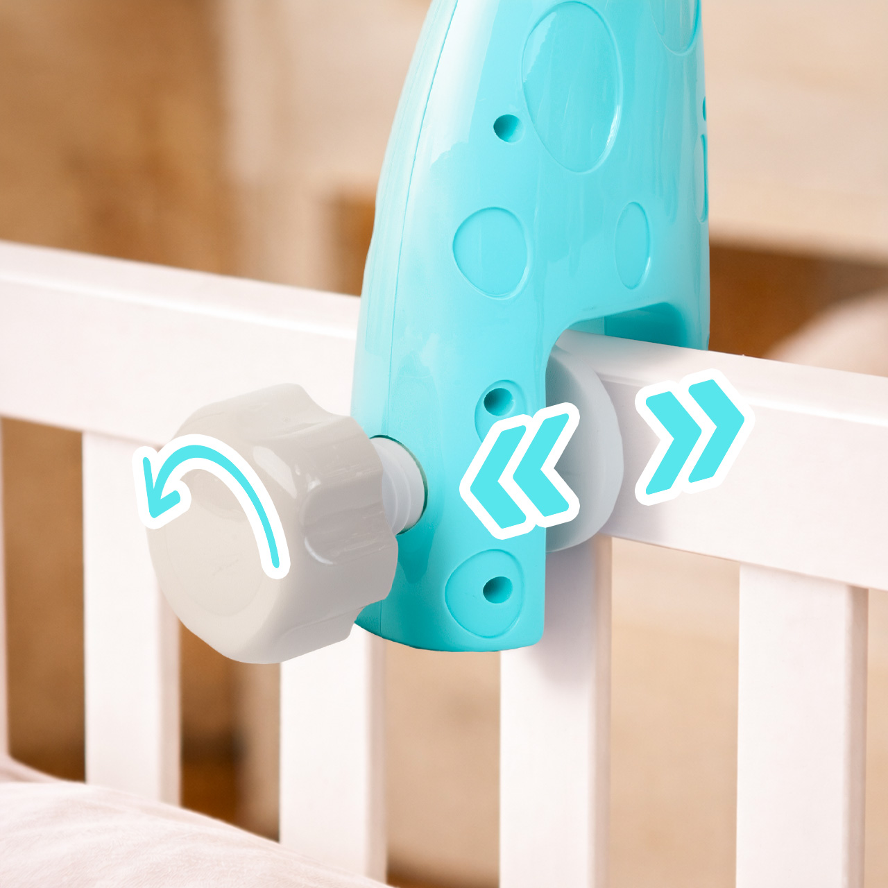 Stabilne mocowanie do łóżeczka pozwala szybko zamontować karuzelkę i ustawić ją nad dzieckiem. Po wszystkim zostaje to, co najważniejsze: komfort i spokój – zarówno dla malucha, jak i rodzica.