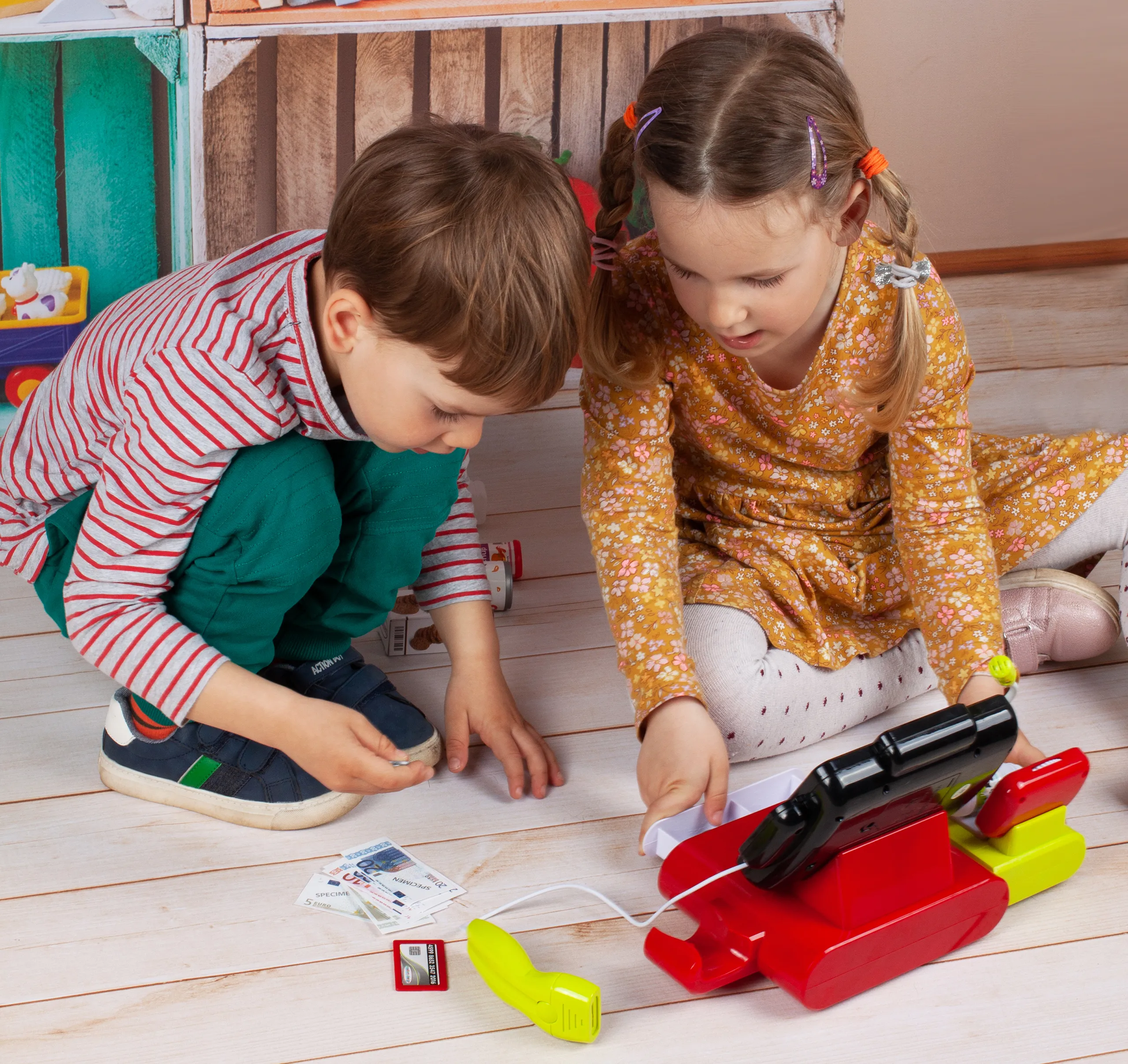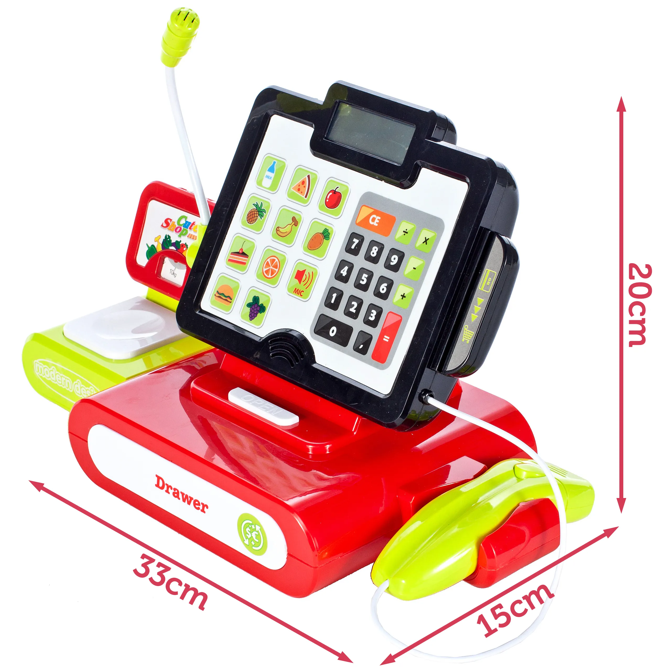 Produkte und Geld sind weitere Elemente des Sets. Die Registrierkasse verfügt außerdem über ein Mikrofon – aktiviert durch Drücken der Taste an der Registrierkasse, einen Zahlungskartenleser und einen Knopf zum Öffnen der Schublade. Eine zusätzliche Attraktion ist ein Barcode-Leser. Beim Scannen von Produkten gibt die Kasse Geräusche von sich und ein rotes Licht leuchtet auf.
