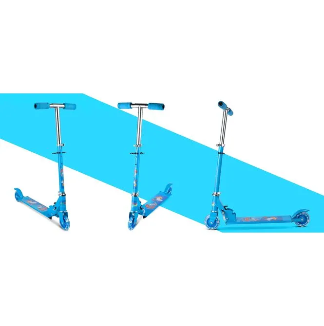 Klapproller mit leuchtenden Rädern. Es ist solide und präzise aus hochwertigem Metall gefertigt. Der Roller hat einen Stahlrahmen und gefederte Räder. Es hat Kunststoffelemente.