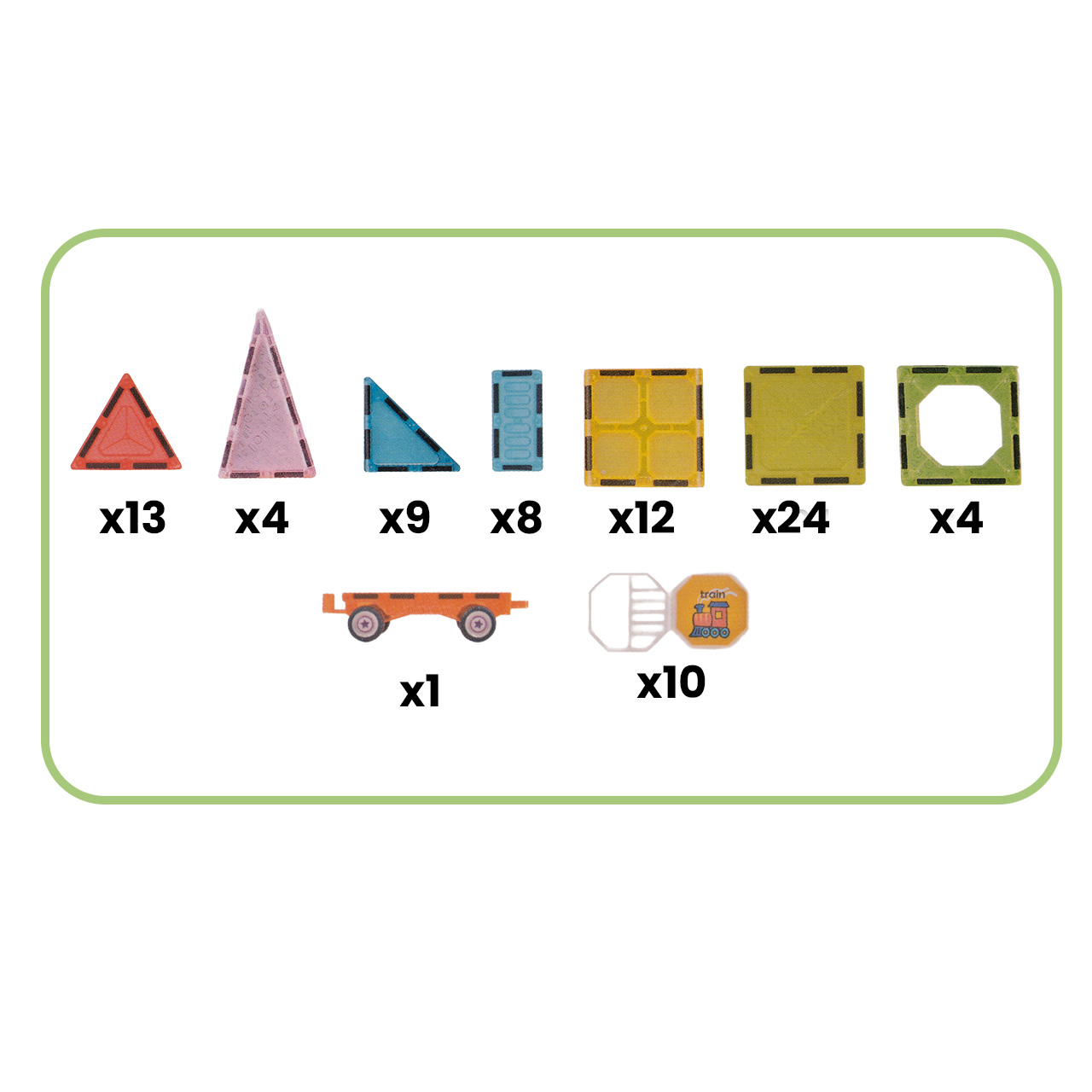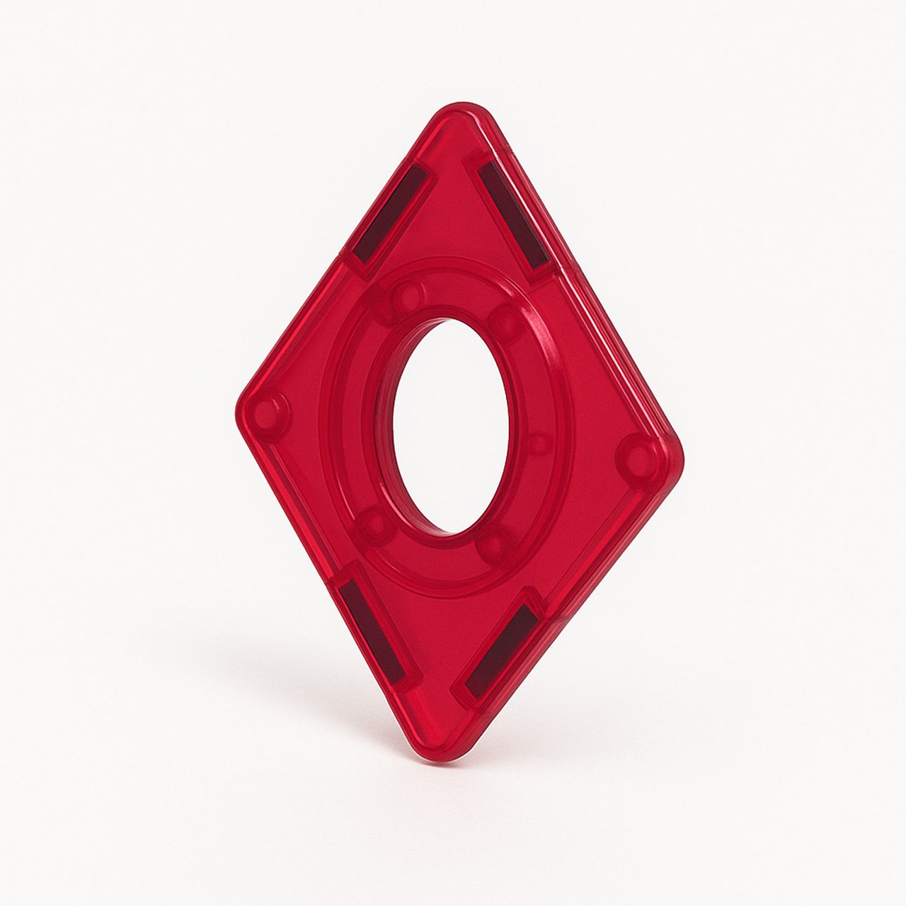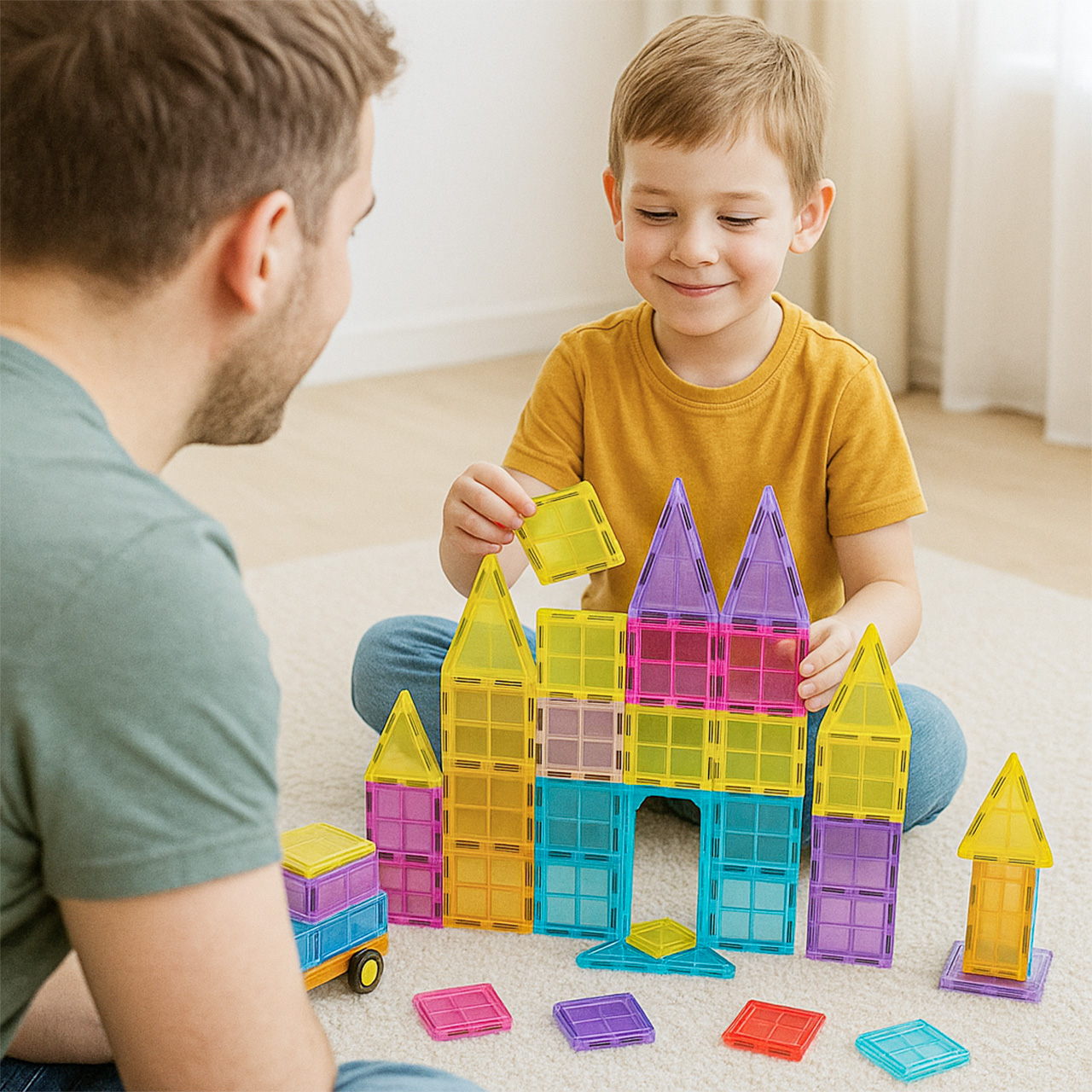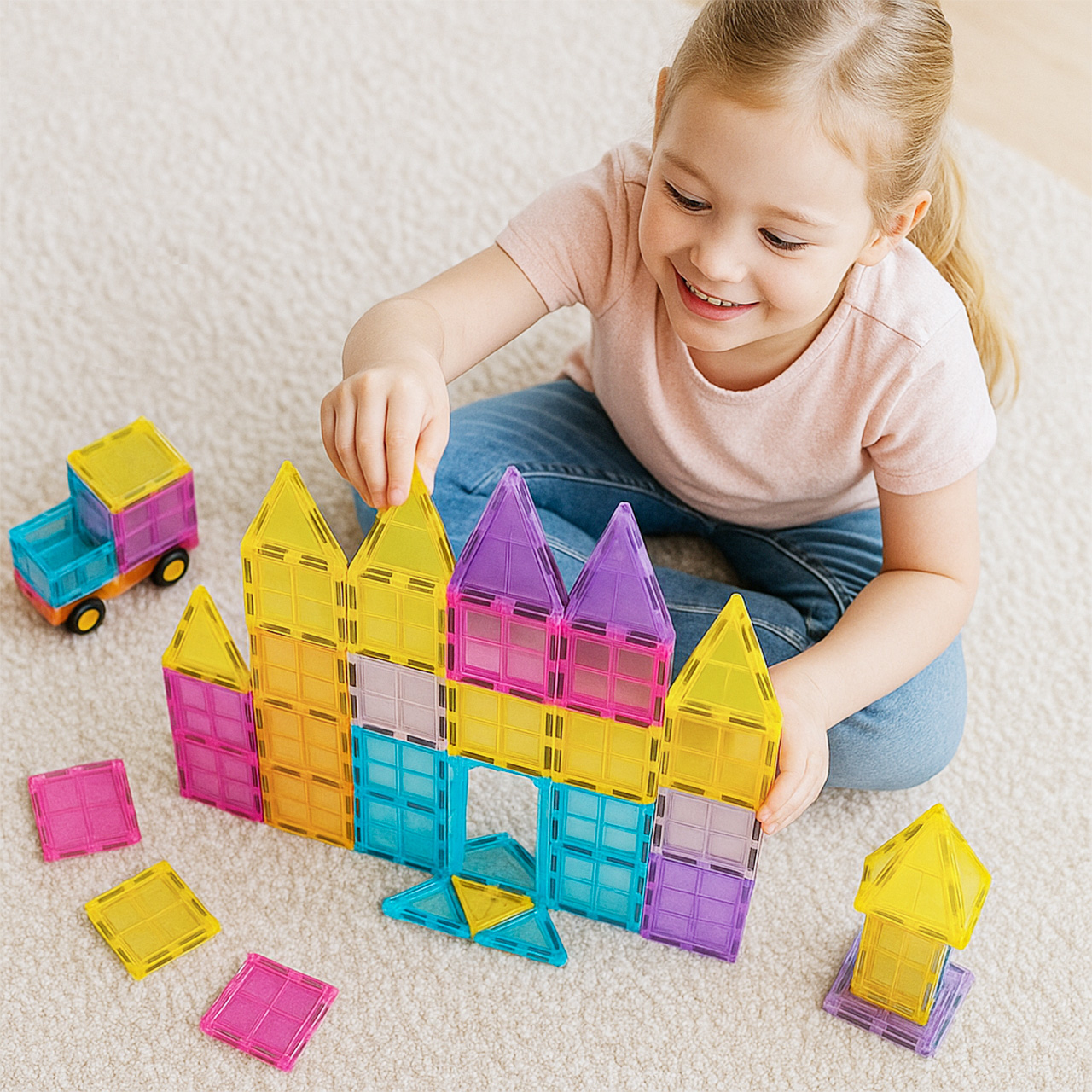 Mocne magnesy i grube ścianki zapewniają sztywność konstrukcji, a zaokrąglone krawędzie i gładka powierzchnia są przyjazne dla małych rączek. Przezroczyste kolory pięknie przepuszczają światło – świetna zabawa przy oknie lub latarce.