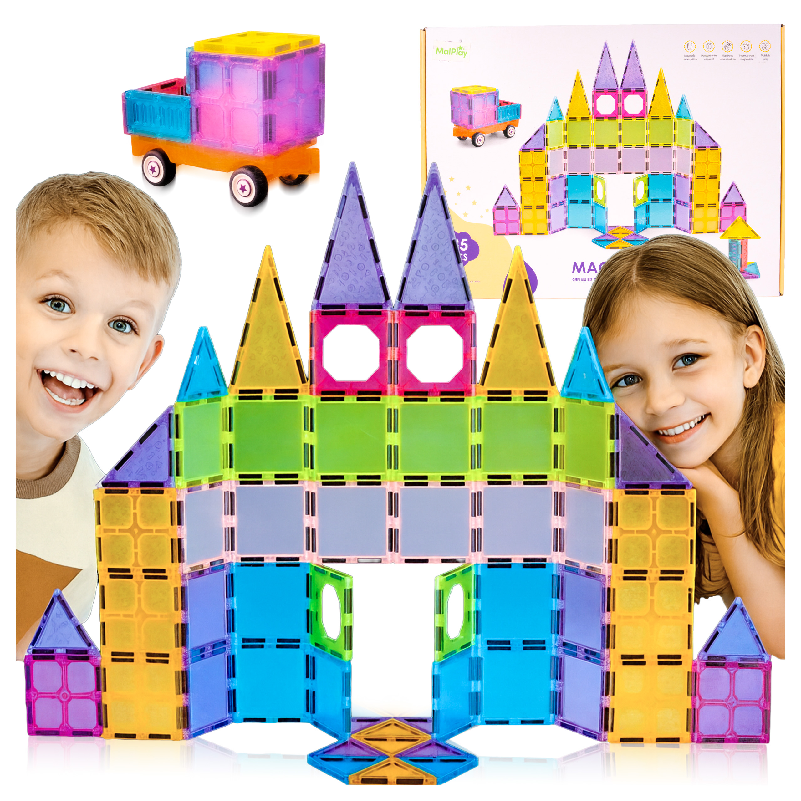Płytki łączą się „same” – magnes przyciąga element do elementu i pozwala tworzyć bryły: zamki, domy, garaże, mury, pojazdy czy rakiety. Dzięki różnym kształtom z łatwością powstają dachy, wieże i kopuły.