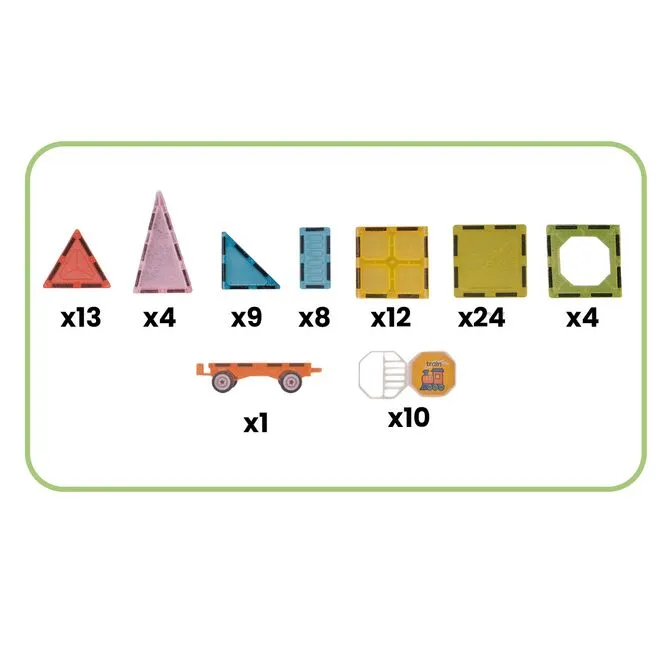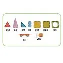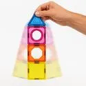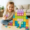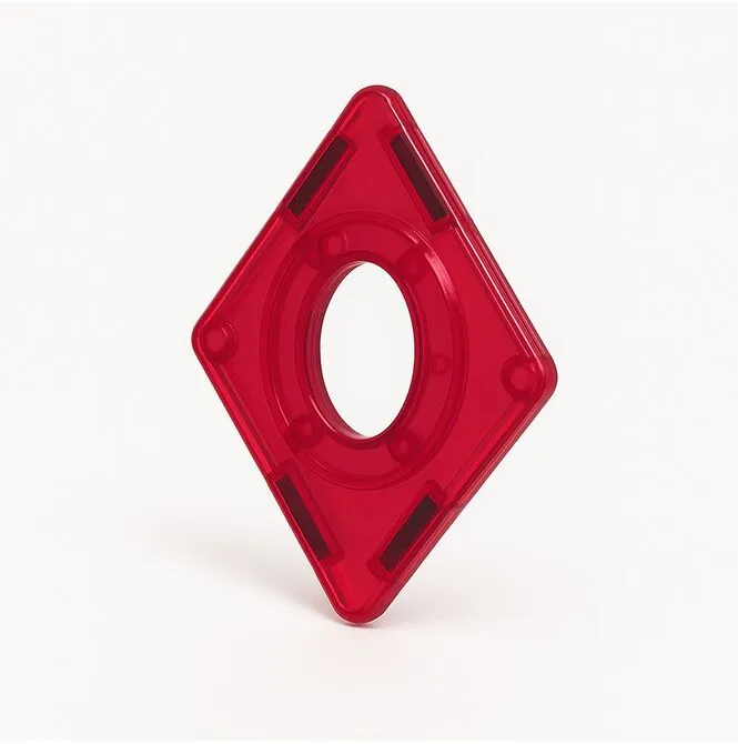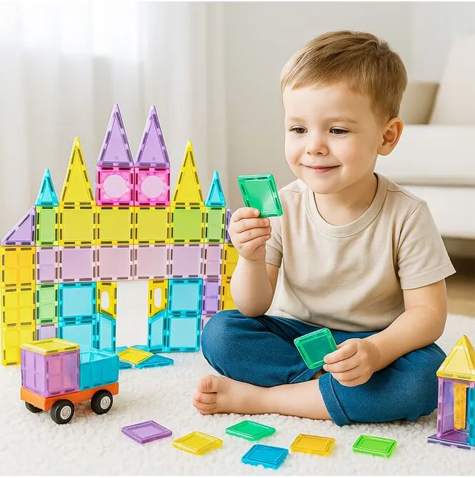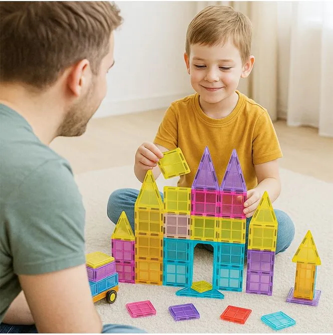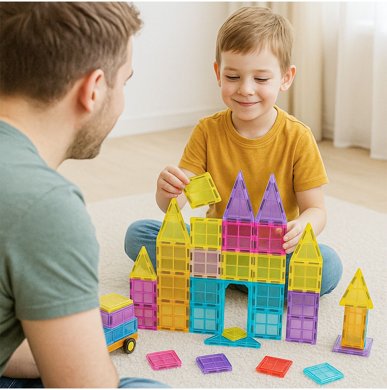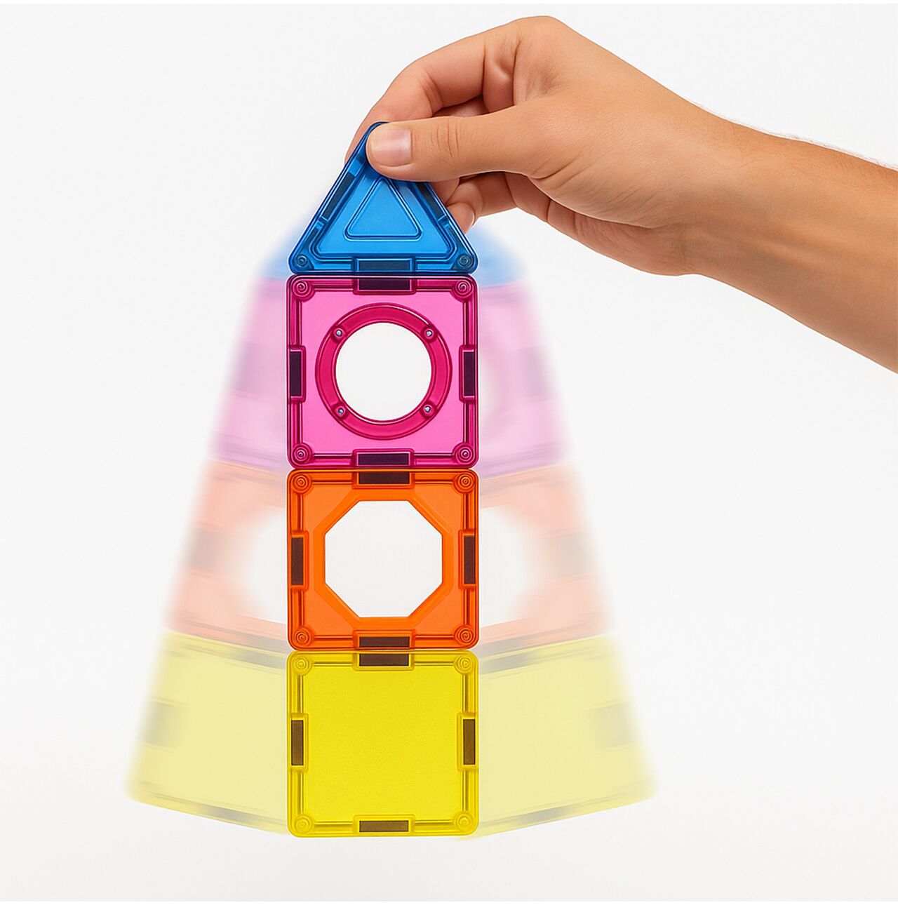 Mocne magnesy i grube ścianki zapewniają sztywność konstrukcji, a zaokrąglone krawędzie i gładka powierzchnia są przyjazne dla małych rączek. Przezroczyste kolory pięknie przepuszczają światło – świetna zabawa przy oknie lub latarce.