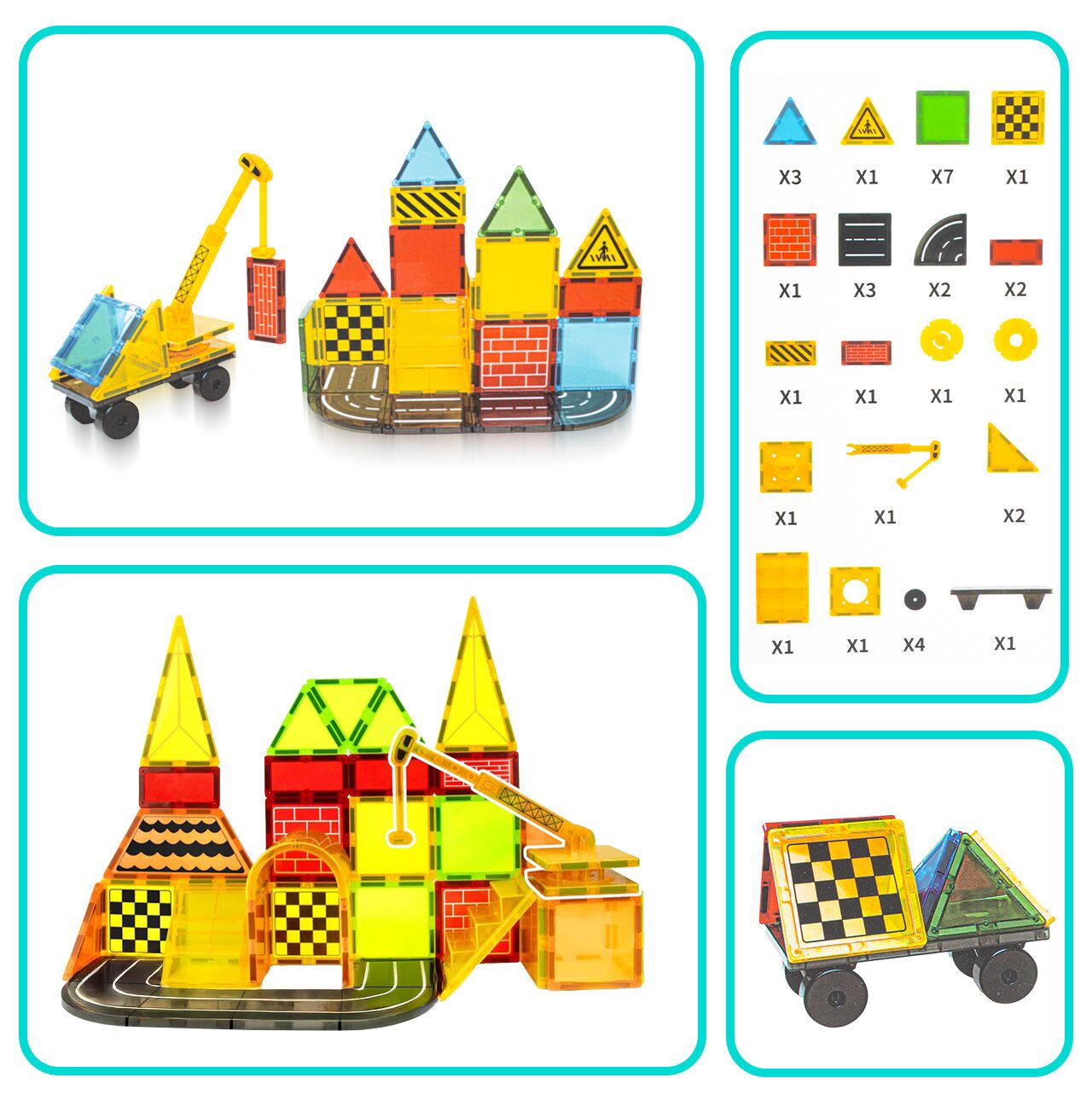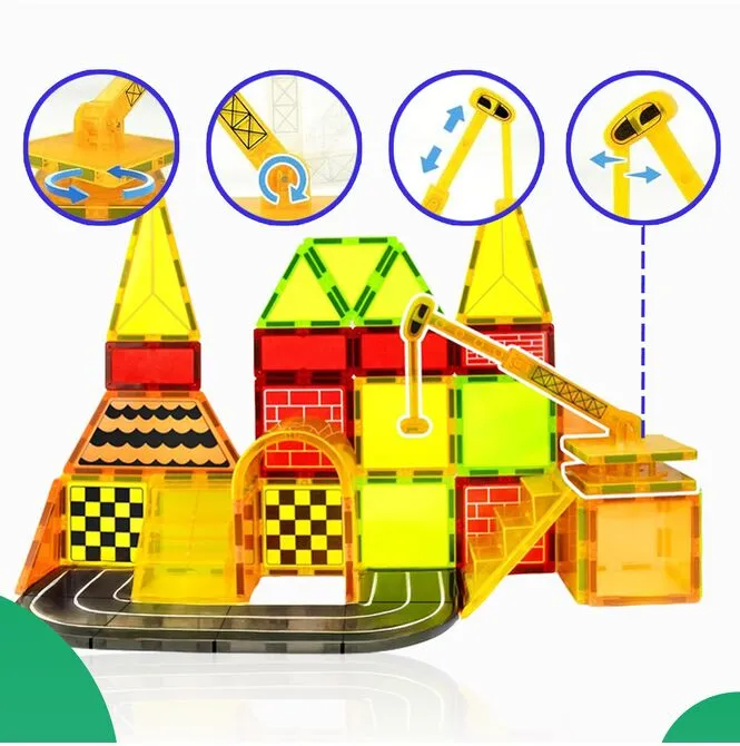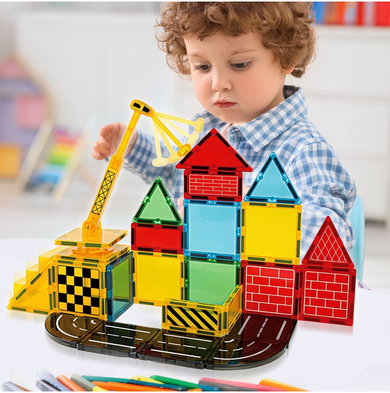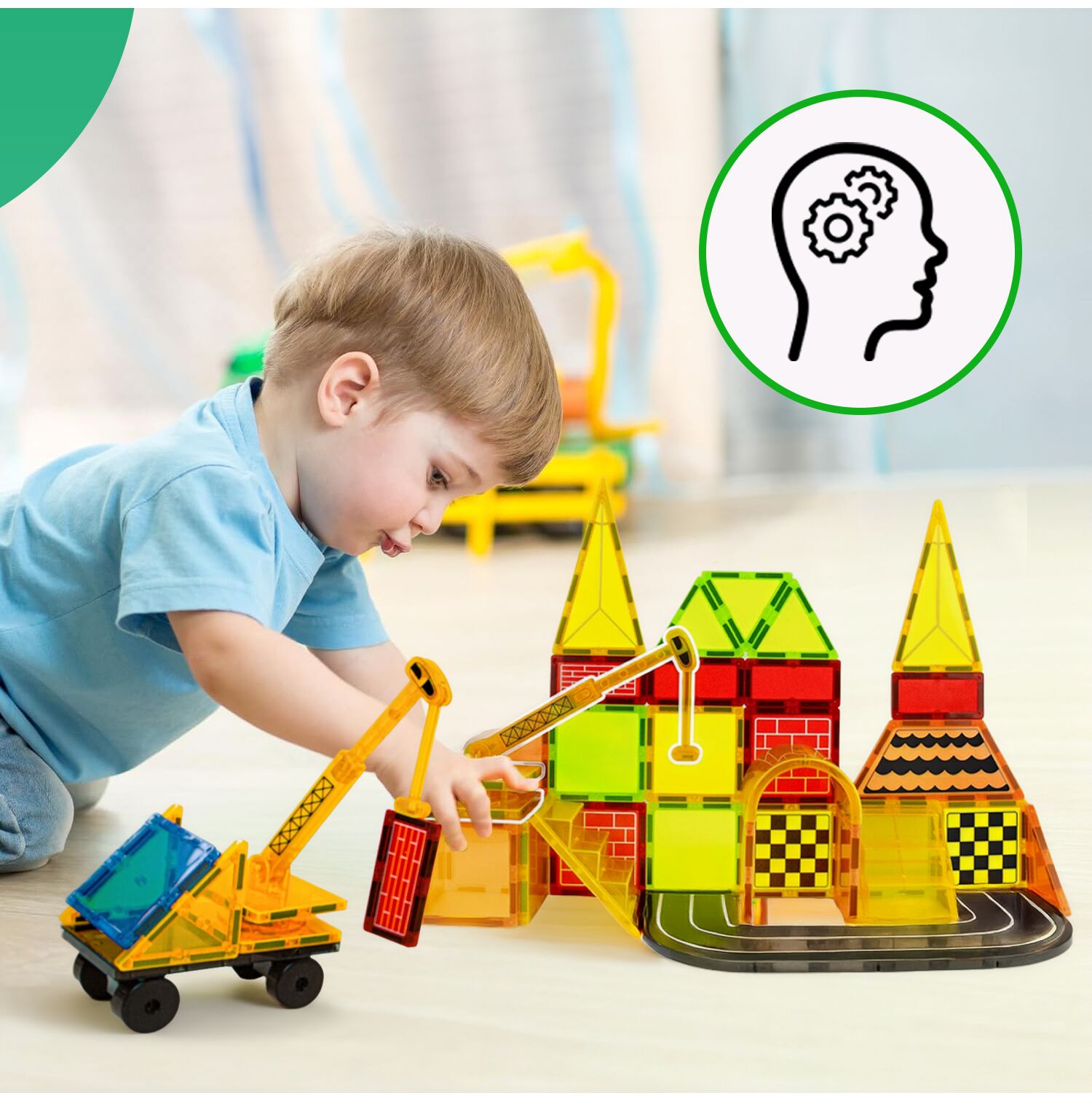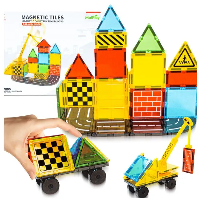 Magnetyczne kafelki łączą naukę z zabawą: dziecko eksperymentuje z geometrią, symetrią i równowagą, planuje kolejne kroki, uczy się przyczynowo-skutkowo (jak zmiana elementu wpływa na stabilność). Budowanie i manipulowanie żurawiem ćwiczy chwyt pęsetkowy i precyzję ruchów, a wspólne projektowanie z rodzicami lub rodzeństwem wzmacnia komunikację i współpracę. To świetne wprowadzenie do STEM – inżynierii, matematyki i kreatywnego rozwiązywania problemów.