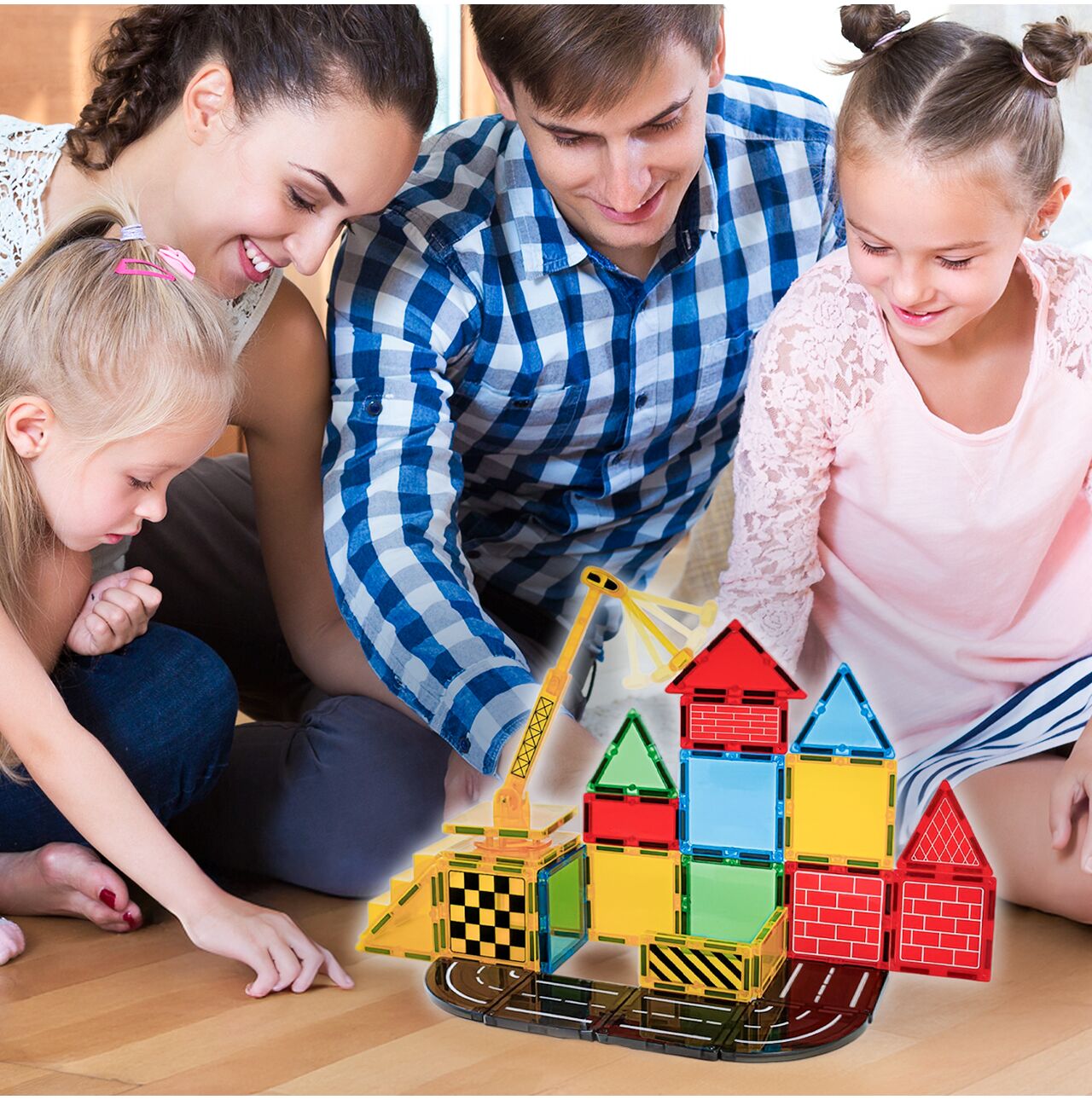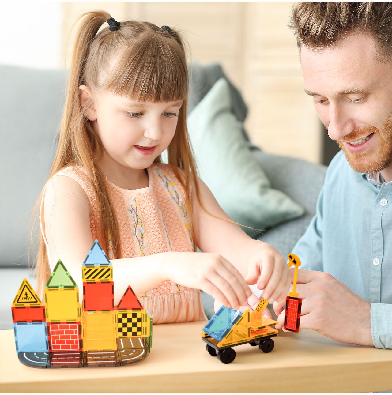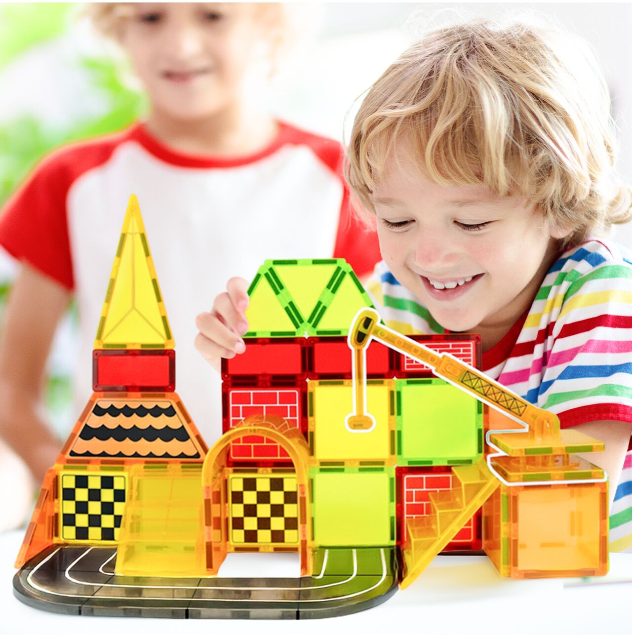 Magnetyczne kafelki łączą naukę z zabawą: dziecko eksperymentuje z geometrią, symetrią i równowagą, planuje kolejne kroki, uczy się przyczynowo-skutkowo (jak zmiana elementu wpływa na stabilność). Budowanie i manipulowanie żurawiem ćwiczy chwyt pęsetkowy i precyzję ruchów, a wspólne projektowanie z rodzicami lub rodzeństwem wzmacnia komunikację i współpracę. To świetne wprowadzenie do STEM – inżynierii, matematyki i kreatywnego rozwiązywania problemów.