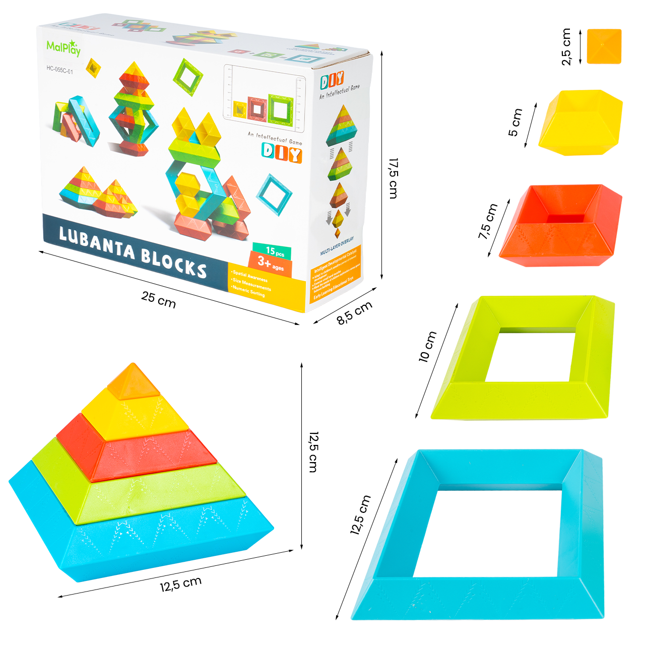 15 elementów to złoty środek: zestaw jest poręczny, mieści się w plecaku, a jednocześnie pozwala tworzyć zaskakująco różnorodne formy. Idealny do domu, przedszkola i w podróż.
