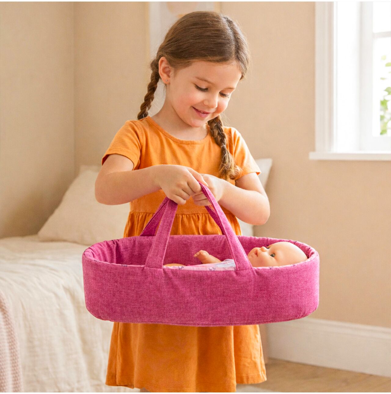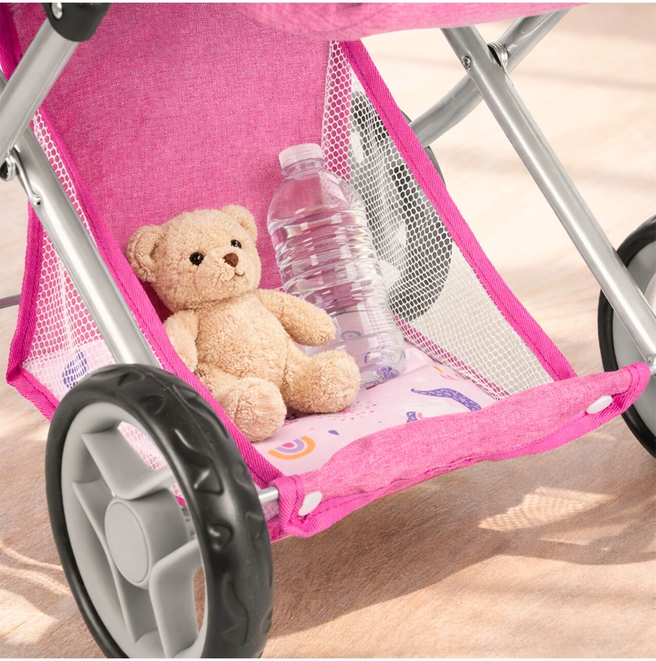 Nejde o detail – je to úložný prostor na všechno, co si děti chtějí vzít s sebou: lahvičku pro panenky, deku, hračky, potraviny. Košík znamená méně nošení a plynulejší hraní.
