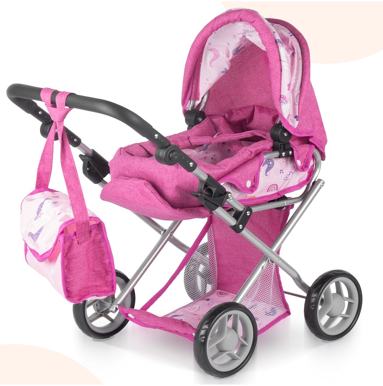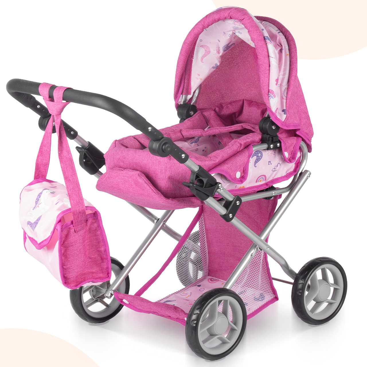 - Vzor jednorožců: jemné růžové barvy s motivem jednorožce, skutečně kočárekový vzhled